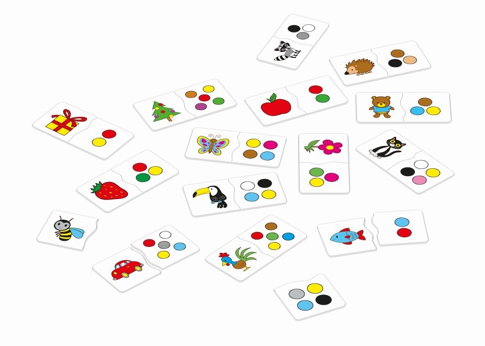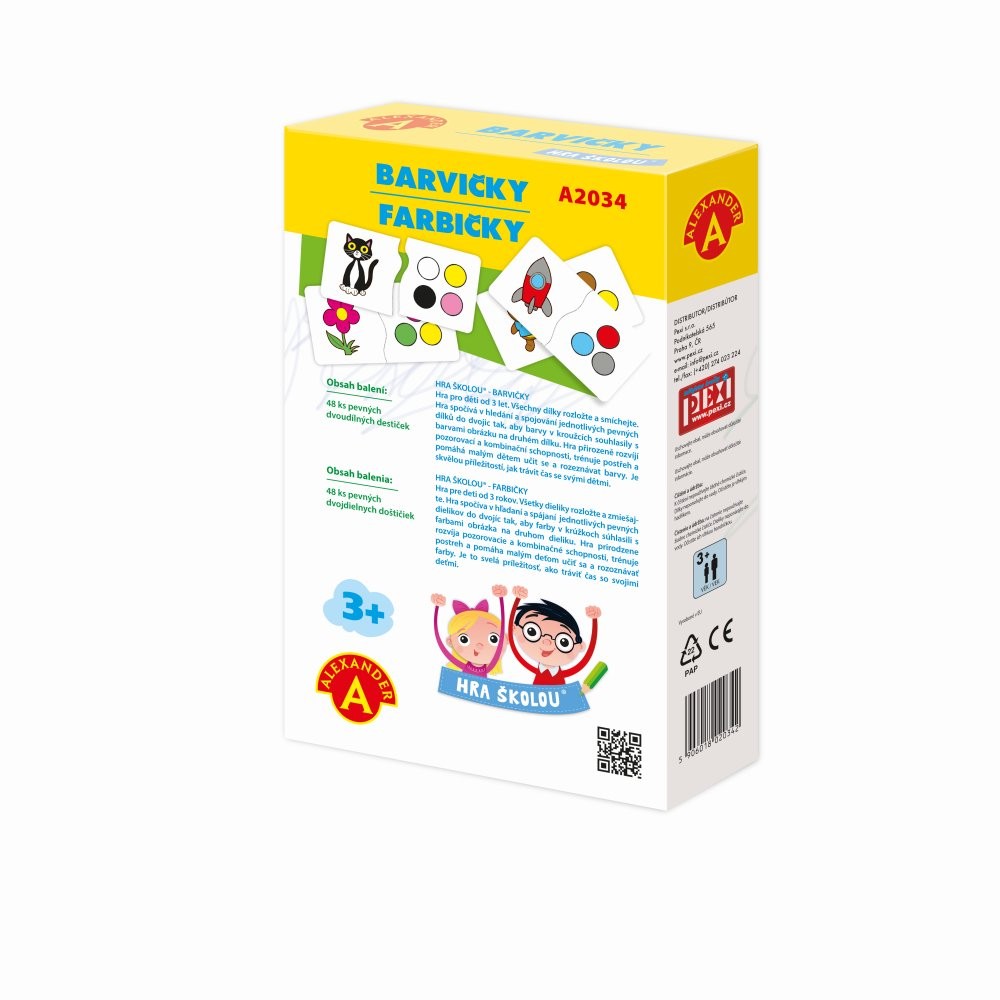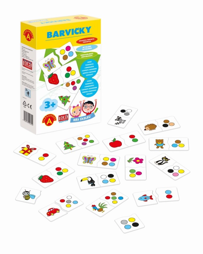 Ocenění Hračka roku 2018-3.místo. HRA ŠKOLOU® - BARVIČKY je naučná hra pro děti od 3 let, pomocí níž se děti učí zábavnou formou rozvíjet své schopnosti. Učí se rozpoznávat barvy a přiřazovat je ke správnému obrázku, zlepšují si postřeh a soustředění. Znalost barev je jedna ze základních dovedností dětí ještě ve školkovém věku. Tato hra za pomoci kartiček s obrázky pomáhá dětem poznávat a pojmenovávat jednotlivé základní barvy. Hra BARVIČKY se skládá z 24 různých destiček. Jedna destička se vždy skládá ze dvou polovin. Jesna polovina obsahuje jeden obrázek a druhá půlka různobarevná kolečka. Barva koleček se shoduje s barvami, které obsahuje obrázek na odpovídající druhé části. Úkolem dětí je najít 2 kartičky kde jsou stejné barvičky jak na obrázku, tak v kolečkách a přiložit je k sobě. Vlnovkové spojení obou polovin destiček dětem napoví, jestli jejich úsilí bylo úspěšné. Zábavnou formou se tak děti učí nejen barvičky, ale hraní podporuje také pozorovací schopnosti a logiku, a v neposlední řadě jemnou motoriku dětských ručiček. - učí poznávat barvy - pomáhá zlepšovat jemnou motoriku - rozvíjí pozorovací schopnosti a postřeh Balení obsahuje: 48 pevných kartonových destiček s obrázky, český a slovenský návod ke hře
