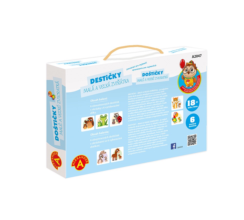 Poznávací jednoduchá naučná hra, která rozvíjí základní schopnosti a znalosti batolat od 18. měsíce věku. Hra ze série "Sovička moudrá hlavička". Principem je správně přiřadit dvojice zvířátek, které k sobě patří. Tím děti rozvíjí logiku, hmat a poznávají barvy a zvířátka. Každá destička má vyndavací dílek. Během hry dítě vnímá a vkládá malé dílky do otvorů v destičkách. Podle zobrazených obrázků pozná, zda k sobě malý a velký dílek patří nebo ne. Pro umístění dílků do otvoru, dítě nejprve prozkoumává jeho tvar a správné natočení. Hra procvičuje motoriku ručiček a motivuje k lepšímu vnímání a logickému myšlení. Garantem poznávacích her je uznávaná psycholožka z varšavské univerzity Alexandra Petrovská.