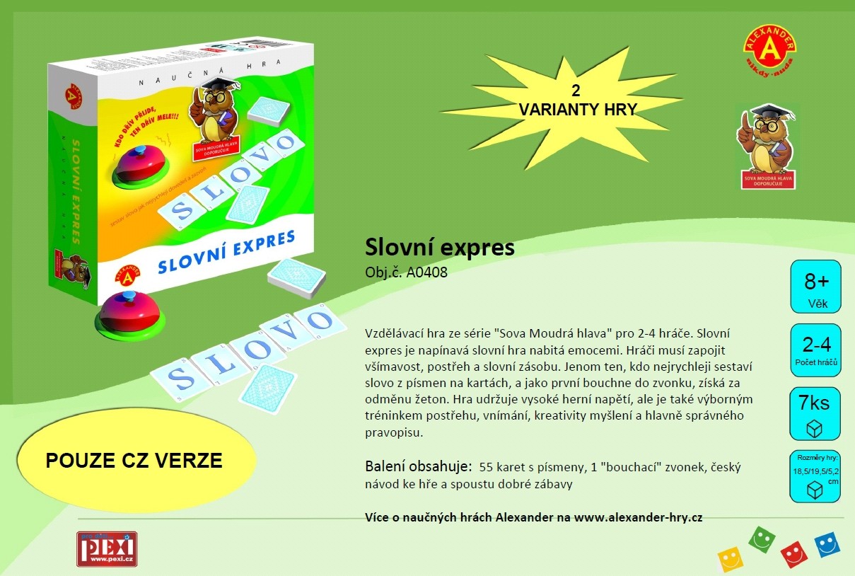 Hra ze série "Sova Moudrá hlava" pro 2-4 hráče od 8 let. Sestav slovo jak nejrychleji umíš a zazvoň. Napínavá slovní hra nabitá emocemi. Hráči musí zapojit všímavost, postřeh a slovní zásobu. Při hře si děti – hráči rozšiřují slovní zásobu, trénuje čtení a upevňují pravopis. Napínavá slovní hra nabitá emocemi. Hráči musí zapojit všímavost, postřeh a slovní zásobu. Jenom ten, kdo nejrychleji sestaví slovo z písmen na kartách, a jako první bouchne do zvonku, získá za odměnu žeton. Hra udržuje vysoké herní napětí, ale je také výborným tréninkem postřehu, vnímání, kreativity myšlení a také správného pravopisu. Balení obsahuje: 55 ks velkých karet s písmeny1 "bouchací" zvonekčeský návod ke hře a spousta dobré zábavy Hlavní vlastnosti: vzdělávací a zároveň zábavná hratrénuje všímavost, postřeh a hlavně správný pravopis