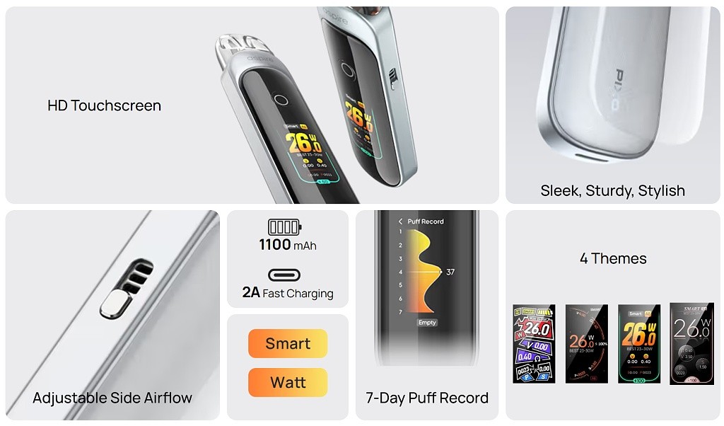 Aspire Pixo Pod - Oceněná elektronická cigareta s 1.47" TFT dotykovým displejem, baterií 1100 mAh, výkonem 30W a Smart režimem. Včetně 2x Pod Cartridge 2ml (0.4Ω/1.0Ω) s mesh žhavícími hlavami. MTL/RDL vapování, USB-C nabíjení, regulace airflow. Prestižní ocenění VAPEXPO Paříž. Barva: Purple (Fialová). Celý popis