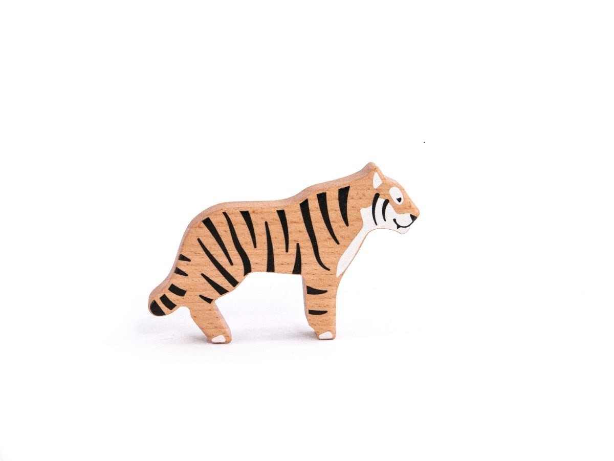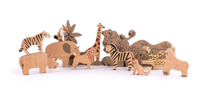 Koho můžete potkat v džungli? Tygra, gorilu nebo tukana.. Zvířátka byla navržena v moderním minimalistickém stylu. Liší se velikostí. Některé mají tloušťku 18 mm a jiné 13 mm, díky čemuž ukazují skutečný rozdíl ve velikosti mezi jednotlivými druhy. Figurky perfektně padnou do rukou malého dítěte. Obal této sady je jedinečný. Karton stačí naříznout podél vyznačených zářezů a vytvořit divokou džungli. Obsahuje: slona, gorilu, zebru, lva, tygra, nosorožce, hada, žirafu, krokodýla, tukana a opici. Velikost figurek: Slon: 14x10,6x1,8 cmGorila: 9,4x10x1,8 cmZebra: 10,2x11,6x1,8 cmLev : 11x8,5x1,8 cmTygr: 12,5x8x1,8 cmNosorožec: 14,5x7,6x1,8 cmHad: 14x14, 6x1,3 cmŽirafa: 9,4x19x1,3 cmKrokodýl: 17x 5x1,8 cmTukan: 6,6x5,7x1,3 cmOpice : 7x6x1,3 cm  Jedinečnost dřevěných hraček spočívá v tom, že jsou zcela bezpečné pro zdraví dítěte. Společnost Bajo nabízí mnoho hraček lakovaných barvami, proto je jejich prioritou kvalita a zdravotní nezávadnost, která je potvrzená certifikáty. Kontrolovány a testovány jsou také prvky vyrobené z plastu a kovu.  Tato hračka a obal jsou vyrobeny z přírodních zdrojů a lze je snadno recyklovat. Doporučujeme povrch hračky čistit pouze vlhkým hadříkem. Nevystavujte, prosím, tuto hračku vysokým teplotám nebo vysoké vlhkosti, dřevo se za těchto podmínek může ohýbat a deformovat. Splňuje všechny evropské bezpečnostní normy.  Hlavní vlastnosti: bukové dřevopodněcuje ke kreativní hře