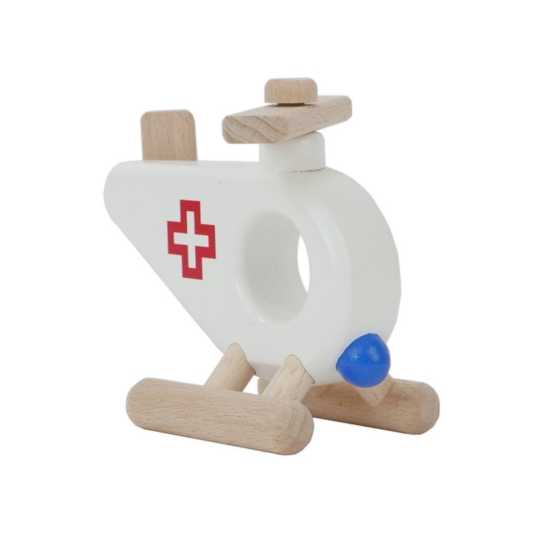 Kdo se to vznáší nad hlavou? Záchranářská helikoptéra. Tato hračka byla navržena s ohledem na malé ruce dítěte. Na tvar, velikost otvoru i pohyblivé prvky. Každý pohyb hračky jako je tlačení, válení, jízda po křivkách nábytku nebo kreslení čar ve vzduchu tak zároveň dopomáhá dítěti objevovat prostor a dynamiku ukrytou v těle. Hra s helikoptérou tedy rozvíjí hrubou motoriku. Doporučujeme povrch hračky čistit pouze vlhkým hadříkem. Nevystavujte, prosím, tuto hračku vysokým teplotám nebo vysoké vlhkosti, dřevo se za těchto podmínek může ohýbat a deformovat. Splňuje všechny evropské bezpečnostní normy. Hlavní vlastnosti: vyrobeno z přírodních zdrojůvhodné pro úchop do malé ručkyrozvíjí hrubou motoriku