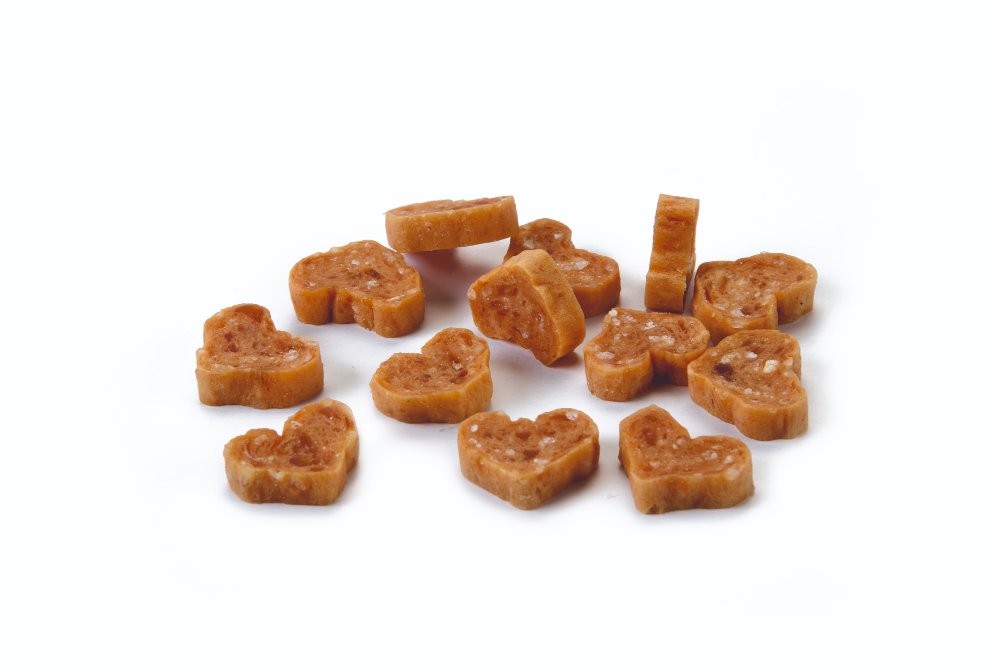 Pamlsky pre mačku s obsahom kuracieho mäsa v tvare srdiečka.