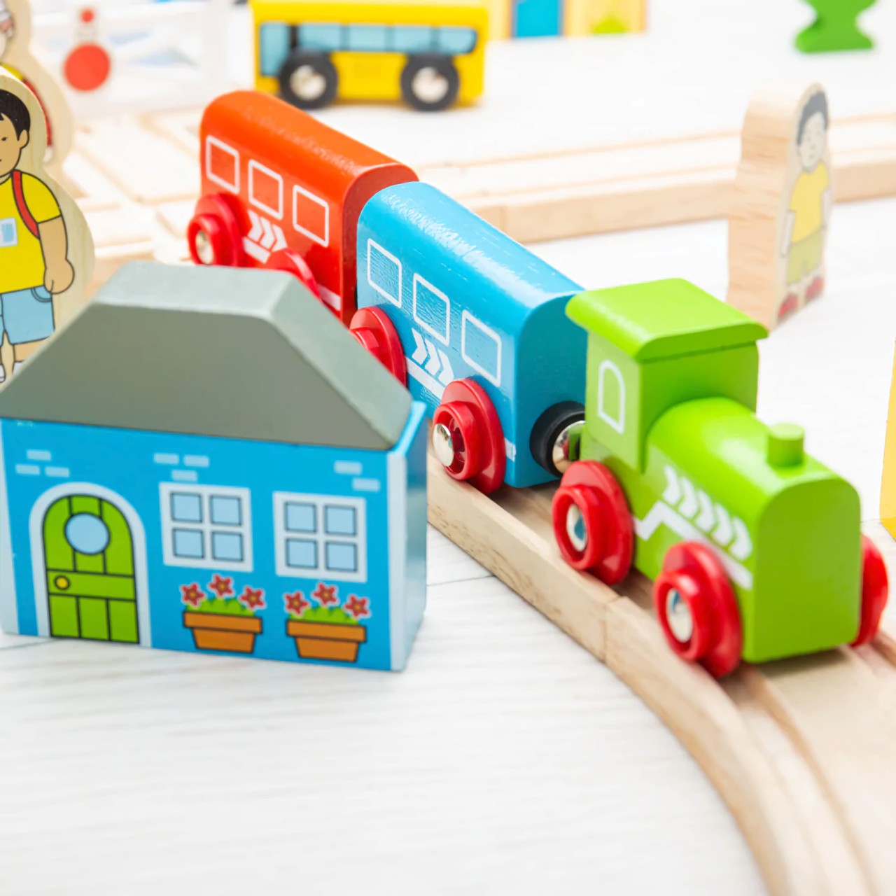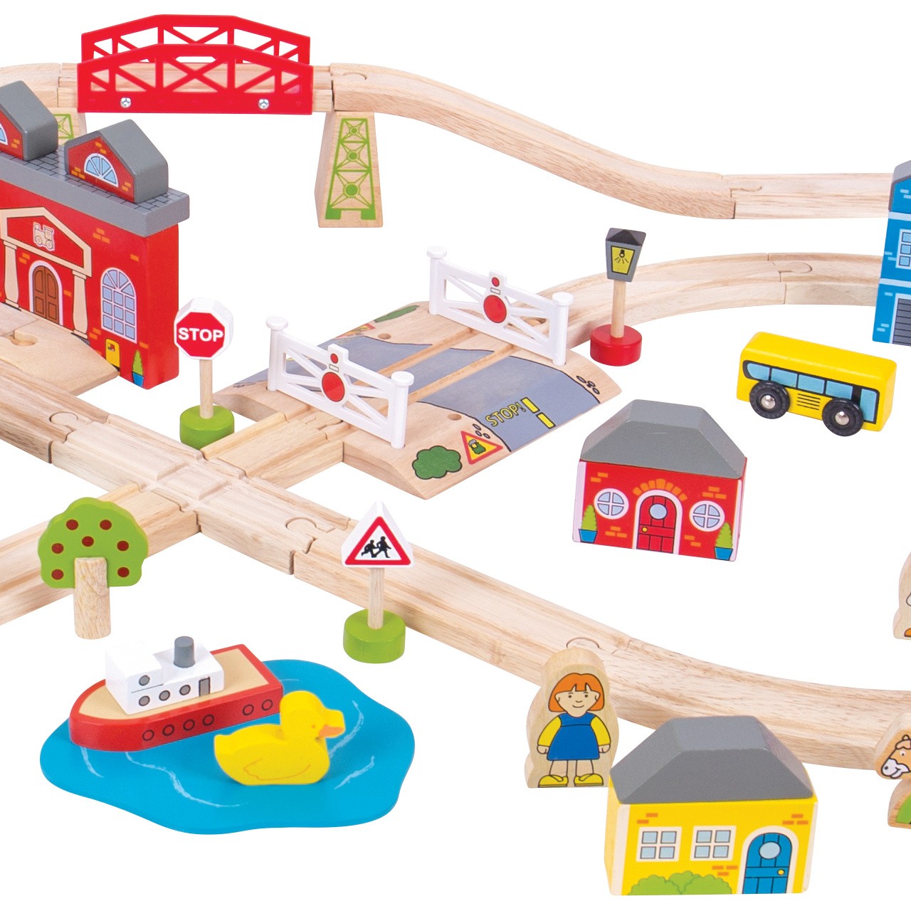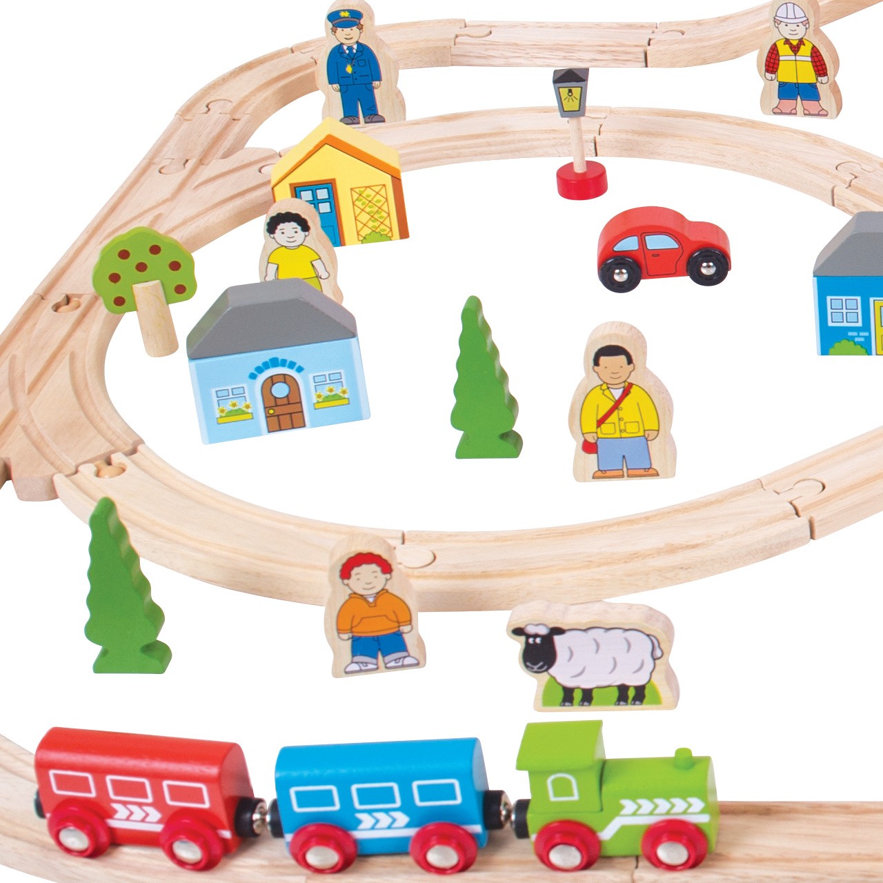 Sada obsahuje 91 kusů. Vláček jezdí přes město, přes most a ven do přírody, projíždí mezi stromy, domy a kolem kostela. Mezitím musí auta trpělivě čekat na vlakovém přejezdu, aby stihl vláček dorazit na nádraží přesně na čas.Hlavní vlastnosti: vláčkodráhy a jejich příslušenství značky Bigjigs Rail je možno kombinovat se všemi dalšími dřevěnými vláčkodráhami na trhuvyrobeno z kvalitních a zodpovědně získaných přírodních materiálůodpovídá současným evropským bezpečnostním normámpodporuje představivost, obratnost a koordinaci