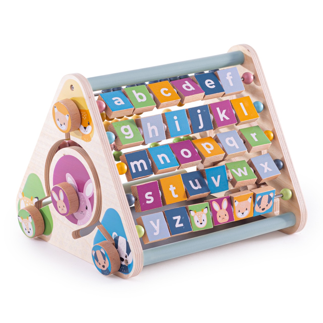 Prozkoumejte zvířecí kostky, otáčejte čtverečky s abecedou, složte zvířecí obličeje... to vše s aktivním trojúhelníkem z FSC dřeva. Pět stran plných zábavy, děti se naučí počítat s korálkovým počítadlem, naučí se také rozeznávat zvířata a mnoho dalšího.Kromě již zmíněných aktivit zde najdete také křídovou tabuli, počítadlo, kostky pomohou s tréninkem jemné motoriky dětí. Nejlepší na hračce je, že nemá žádné oddělitelné dílky! Tento dřevěný aktivní trojúhelník pomůže také s rozvojem zručnosti a koordinace.Vyrobeno z kvalitních materiálů ze zodpovědných zdrojů. Malováno netoxickými barvami, které jsou bezpečné pro děti. Splňuje ASTM F963 a evropské bezpečnostní standardy. Hlavní vlastnosti: 5 stran aktivitbez odnímatelných dílků100% FSC dřevo Značka a certifikát FSC® (Forest Stewardship Council) zaručuje, že dřevo, ze kterého byl produkt vyroben, nebylo vytěženo nelegálně a pochází z lesů obhospodařovaných šetrným či přírodě blízkým způsobem, ve kterém jsou dodržovány přísné environmentální a sociální požadavky. Značka FSC® na výrobku znamená, že svým nákupem pomáháte chránit lesy a podporujete šetrné, odpovědné či přírodě blízké hospodaření, díky kterému jsou naše lesy stabilnější, zdravější, mají přirozenou druhovou skladbu a lépe odolávají negativním následkům klimatických změn.