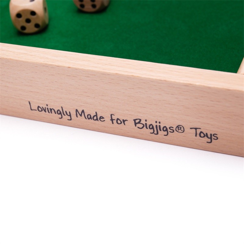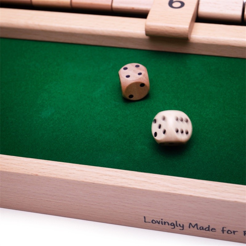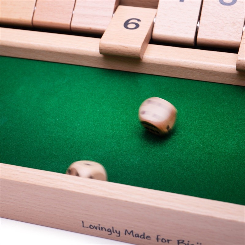 Zábavná hra, která dětem zlepšit jejich numerické dovednosti. Hoďte dvojicí kostek a zavřete destičky, (maximálně dvě) které se rovnají celkovému počtu hodů kostkou. Pokračujte ve hře dokud nebude možné zavřít žádné další destičky. Zbylý součet neotočených destiček si zapište. Hraje se do určeného počtu trestných bodů, zpravidla do 200, vyhrává pak hráč s nejmenším počtem trestných bodů. Vzdělávací a zábavná hra, může ji hrát jeden nebo více hráčů. Tato dřevěná verze hry v tradičně vyrobeném dřevěném rámu s plstěnou hrací deskou. Vyrobeno z vysoce kvalitních, zodpovědně získaných materiálů. Splňuje aktuální evropské bezpečnostní normy. Skládá se ze 3 hracích prvků. Hlavní vlastnosti: hra pro jednoho nebo více hráčůobsahuje 2 kostky a hrací plichtupodporuje matematické dovednosti