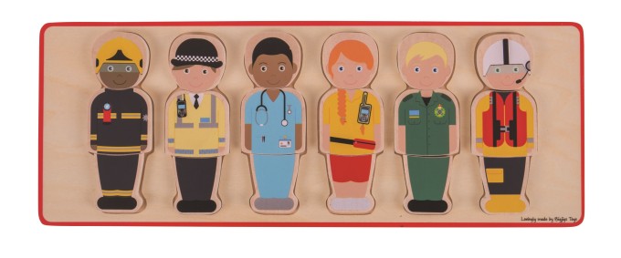 Tito záchranáři jsou Vám připraveni pomoci! Tato robustní dřevěná skládačka obsahuje 6 záchranářů včetně požárníka, policejního důstojníka, doktora, záchranné služby a další! Každá postava se skládá ze tří dřevěných kusů, které umožňují malým dětem kombinovat oblečení pro každého pracovníka. Pomáhá dětem pochopit roli lidí, kteří jim pomáhají v životě. Skvělý způsob, jak rozvíjet slovní zásobu, sladit dovednosti a soustředit se. Podporuje rozvoj jazyka, protože děti hovoří o každém záchranáři a roli, kterou hrají při pomoci lidem. Kompaktní rozměry zajišťují, že tato hádanka je užitečným kamarádem jak doma, tak i na cesty. Vyrobeno z vysoce kvalitních, zodpovědně dodávaných materiálů. Odpovídá současným evropským bezpečnostním normám. Obsahuje 18 dílků. Hlavní vlastnosti: obsahuje 18 dílkůvelké dílky puzzle podporuje komunikační a motorické dovednosti