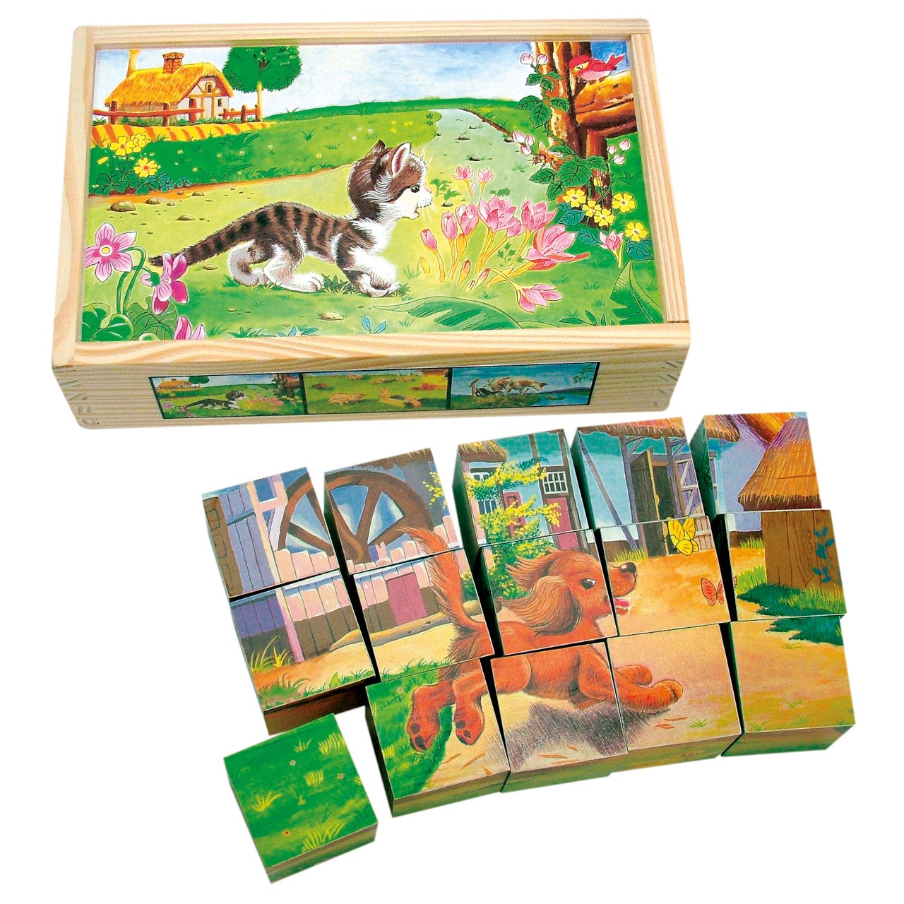 Není nad nejklasičtější z hraček, obrázkové kostky. Potištěné výjevy ze života na vesnici s domácími i hospodářskými zvířátky. Kostky jsou vyrobeny z masivního dřeva a baleny v praktické krabičce z překližky. Hlavní vlastnosti:krabička s víkem a 15 kostek6 různých obrázkůpraktické balení
