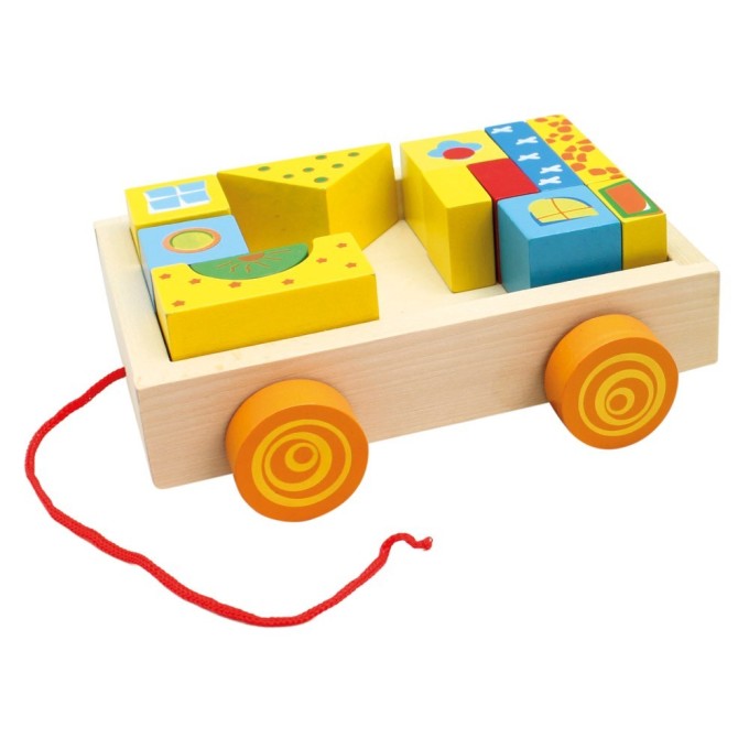 Dřevěný vozík v přírodním provedení s pestrobarevnými kolečky a  kostičkami je základním vybavením všech malých stavitelů. Skvělé pro tvořivost a motoriku. Hračka je robustní, vyrobena z masivního dřeva.   Hlavní vlastnosti:vozík a 18 kostekrobustní dřevěné provedení