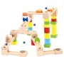 Kuličková dráha pro malé stavitele nadchne konečným výsledkem: je-li správně postavena, kulička projede bez problémů. Díly z masivního dřeva v přírodních a jasných barvách lze sestavovat podle potřeby a celou stavebnici i rozšiřovat. Je možné postavit mnoho různých mostů, tunelů a cest, kterými musí kuličky projít. Stavebnice pomáhá rozvíjet fantazii, technické myšlení i zručnost. Děti se s její pomocí mohou učit soustředění, pozornosti a přesnosti. Hlavní vlastnosti:34 dílů dráhy a 6 kuličeksoučásti z masivního dřeva