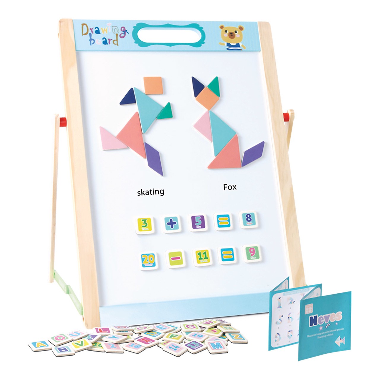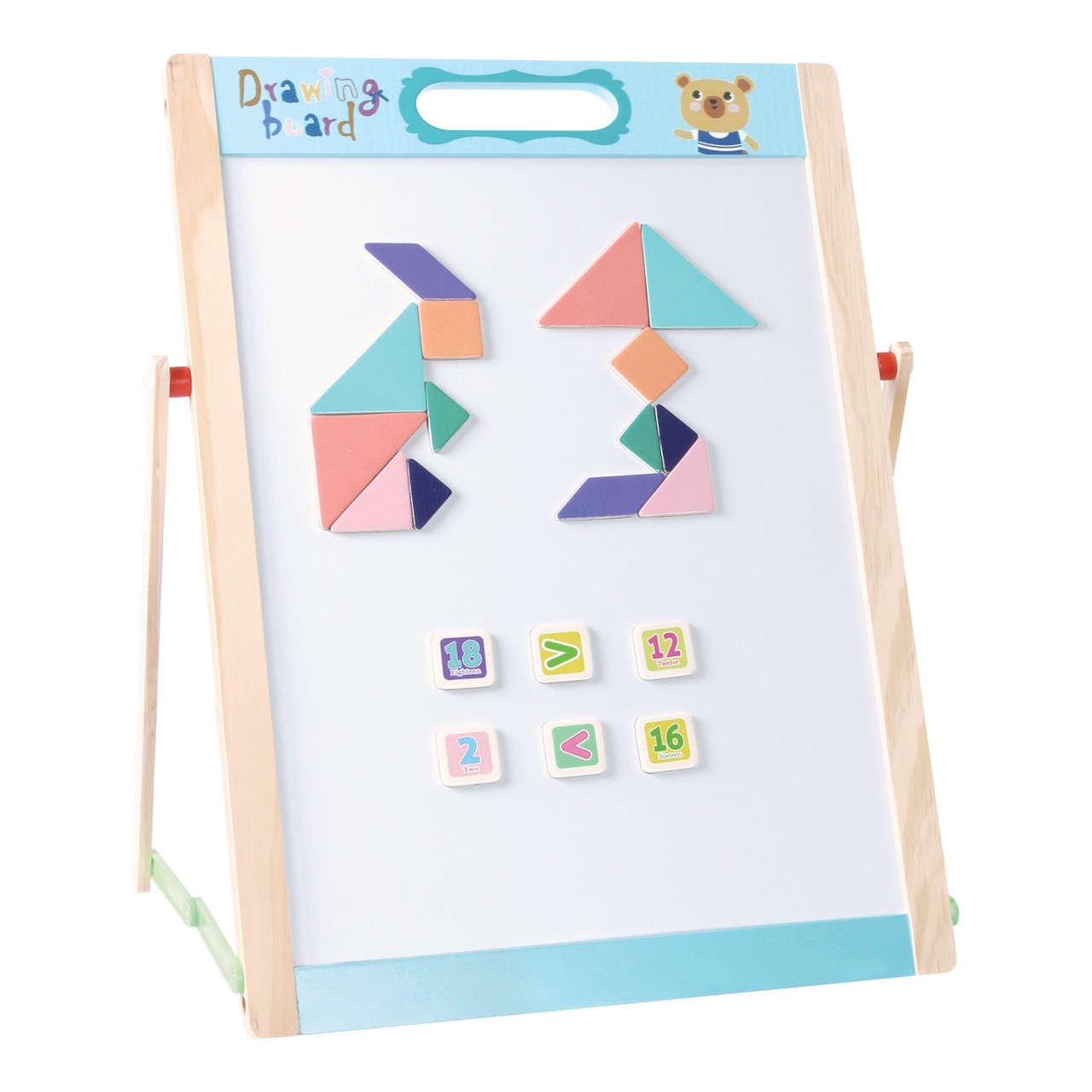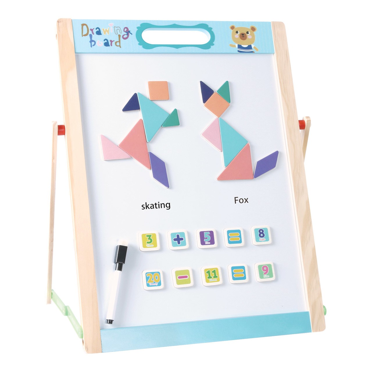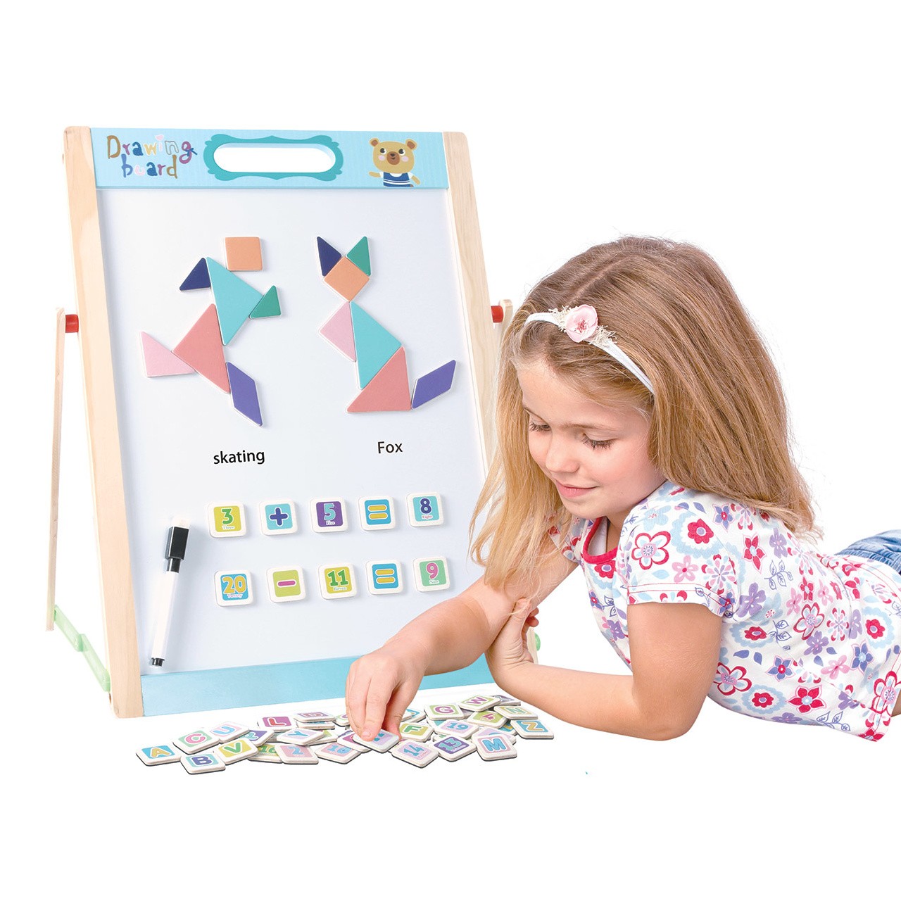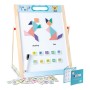 Skládací oboustranná dětská tabule se spoustou příslušenství. Jedna strana je bílá a magnetická pro připevnění přiložených magnetických obrázků nebo pro psaní fixou. Druhá strana je uzpůsobená pro psaní křídou. Součástí je křída, fix a guma. Hrací tabule nabízí spoustu zábavy a radosti při kreslení, psaní a malování. Vytváření mnoha vzorů pomocí magnetických tvarů a šablon podporuje kreativitu vašeho dítěte. Vaše dítě si může hrát na podlaze nebo stole. Tabule se dá složit naplocho a snadno uskladnit. Předškoláci a děti ze základních škol si s touto hračkou užijí nekonečnou zábavu. Skvěle se hodí také na cestování. Hlavní vlastnosti: včetně příslušenstvípodporuje kreativitukompaktní velikostvhodná na cesty