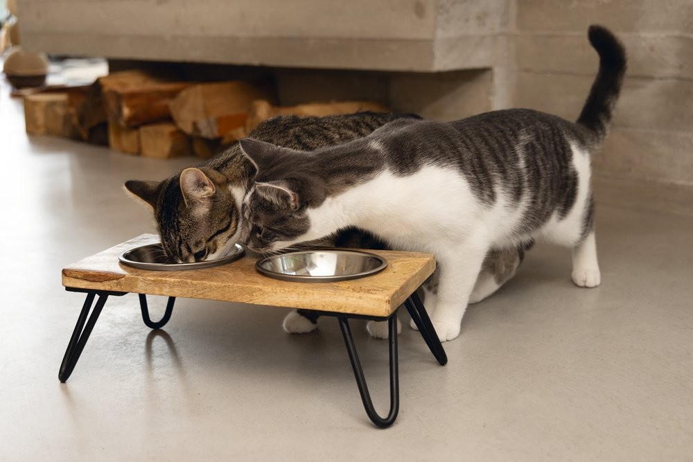 Elegantný stojan z mangového dreva v kombinácii s kovom, 2 nerezové misky. Vhodné pre mačky a malé psy. Celý popis