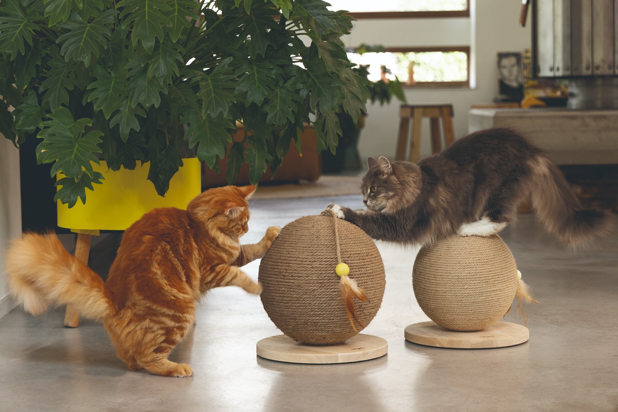 Škrabadlo v tvare gule s hračkou, kombinácia dreva, sisalu a juty. Celý popis