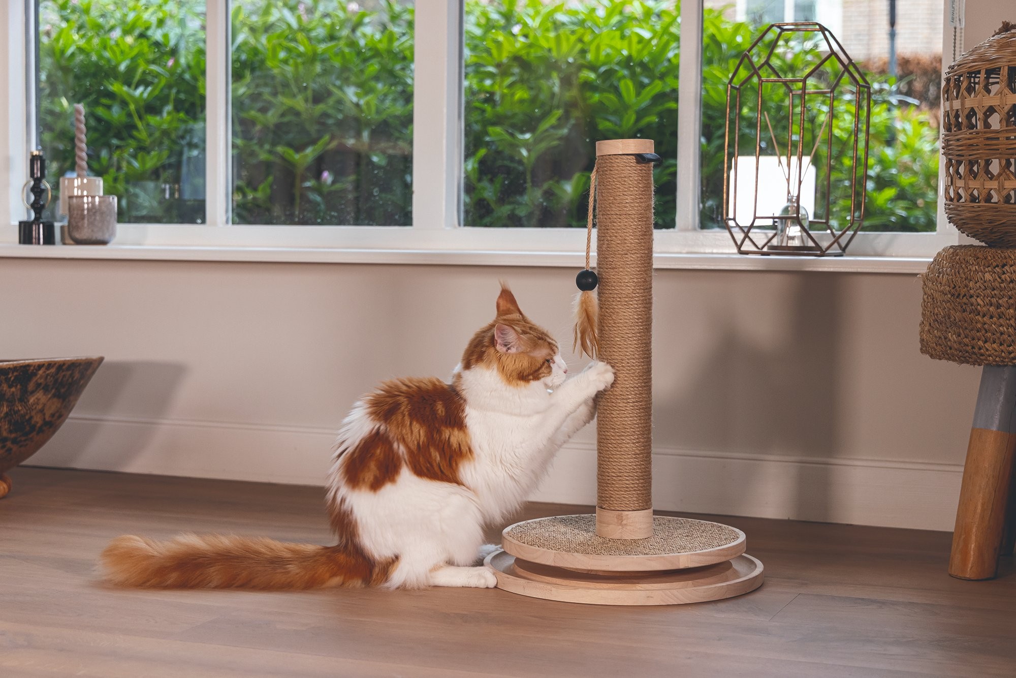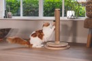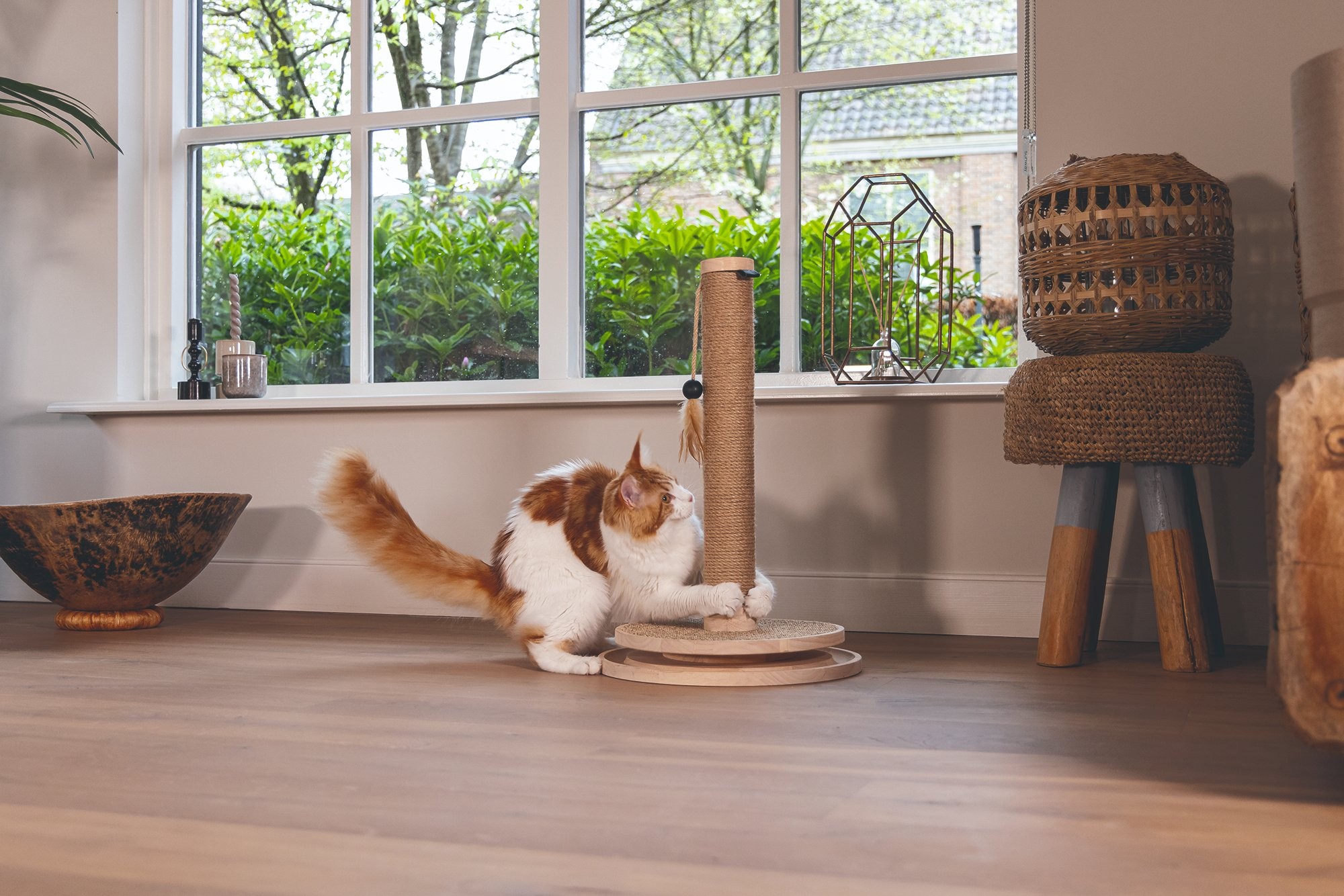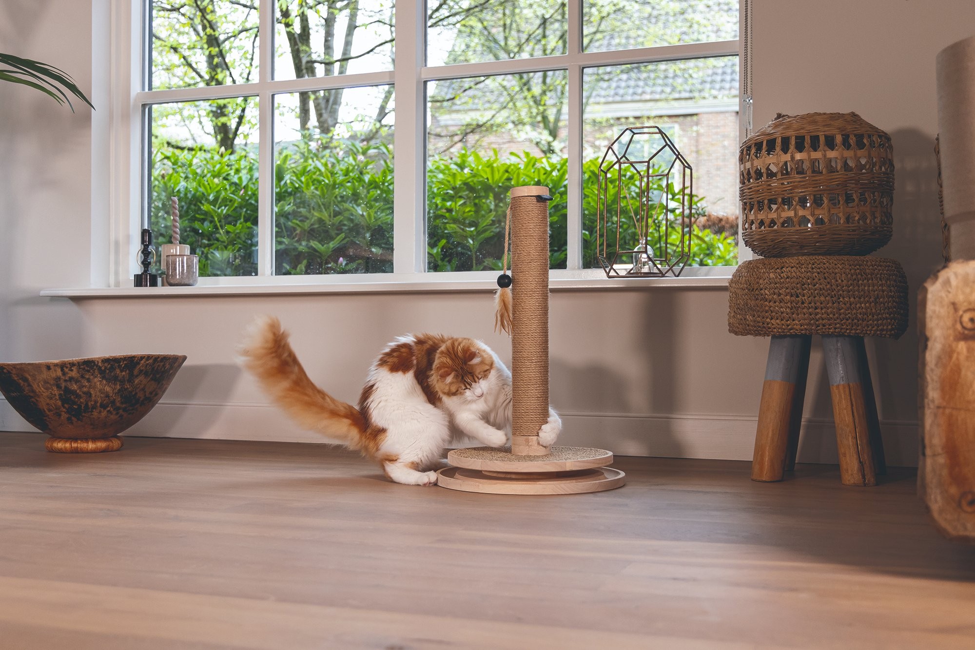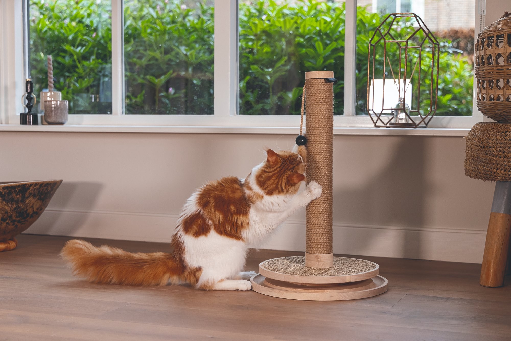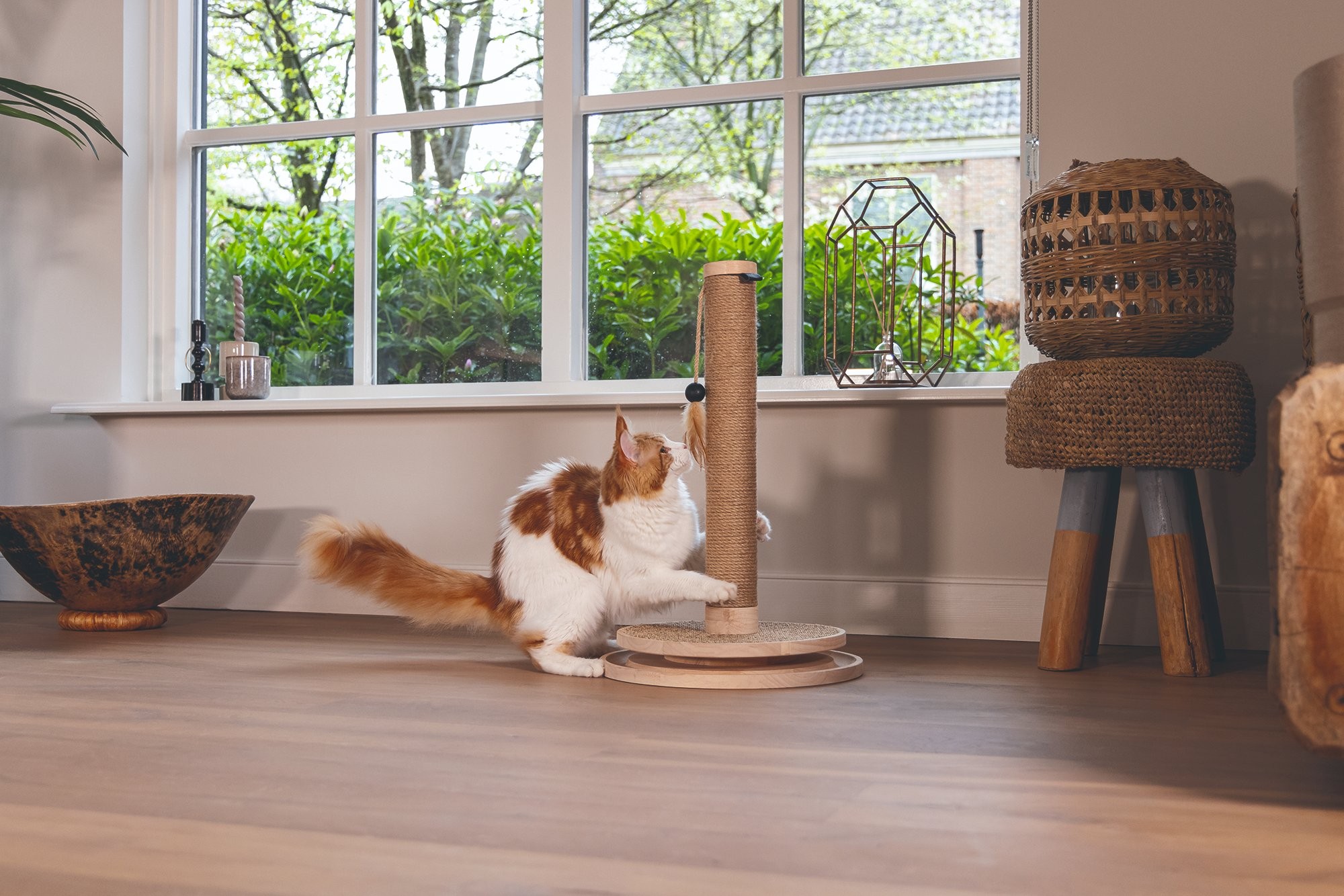 Škrabadlo v prírodných tónoch s hračkami. Kombinácia kaučukového dreva, juty a sisalu.