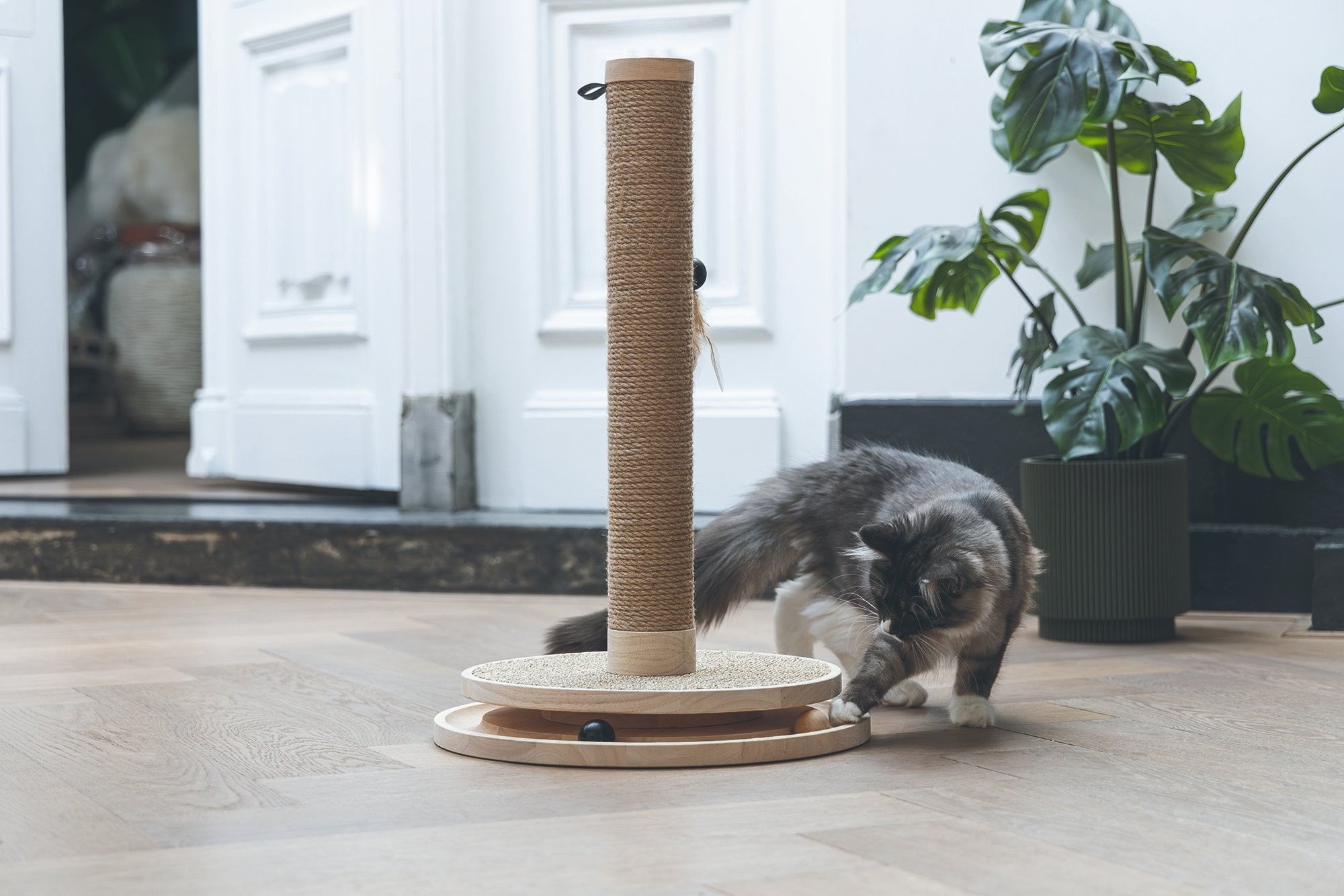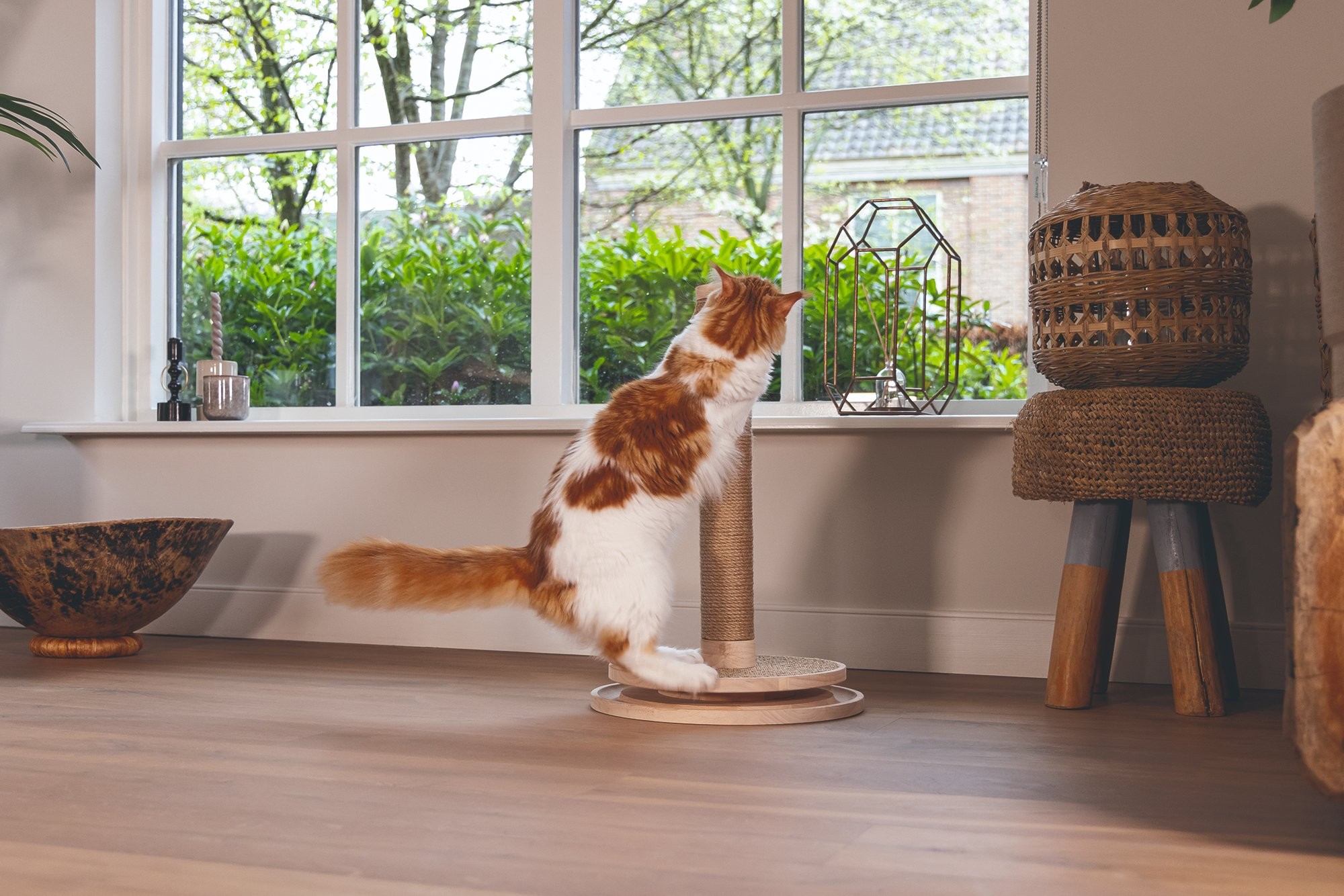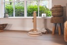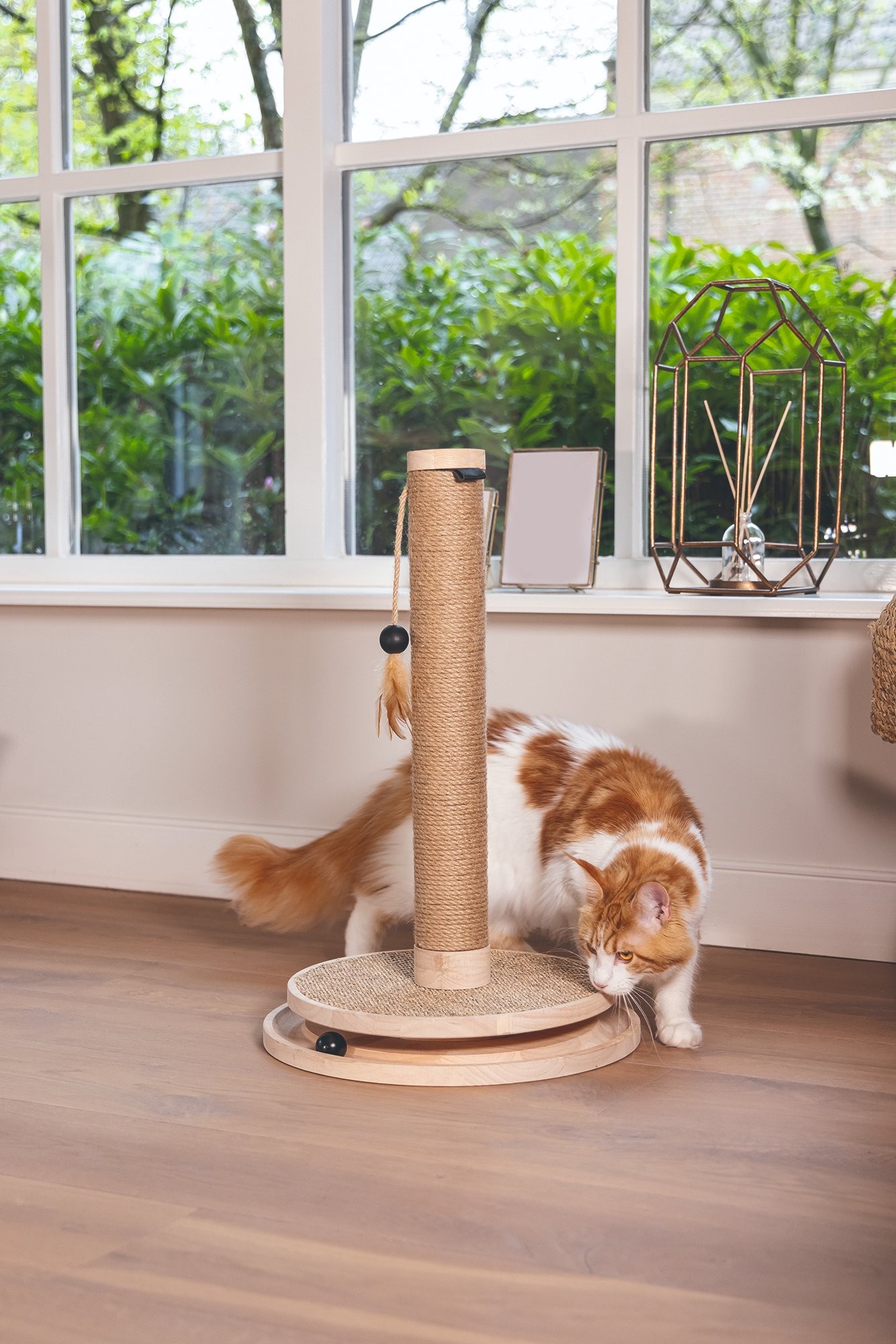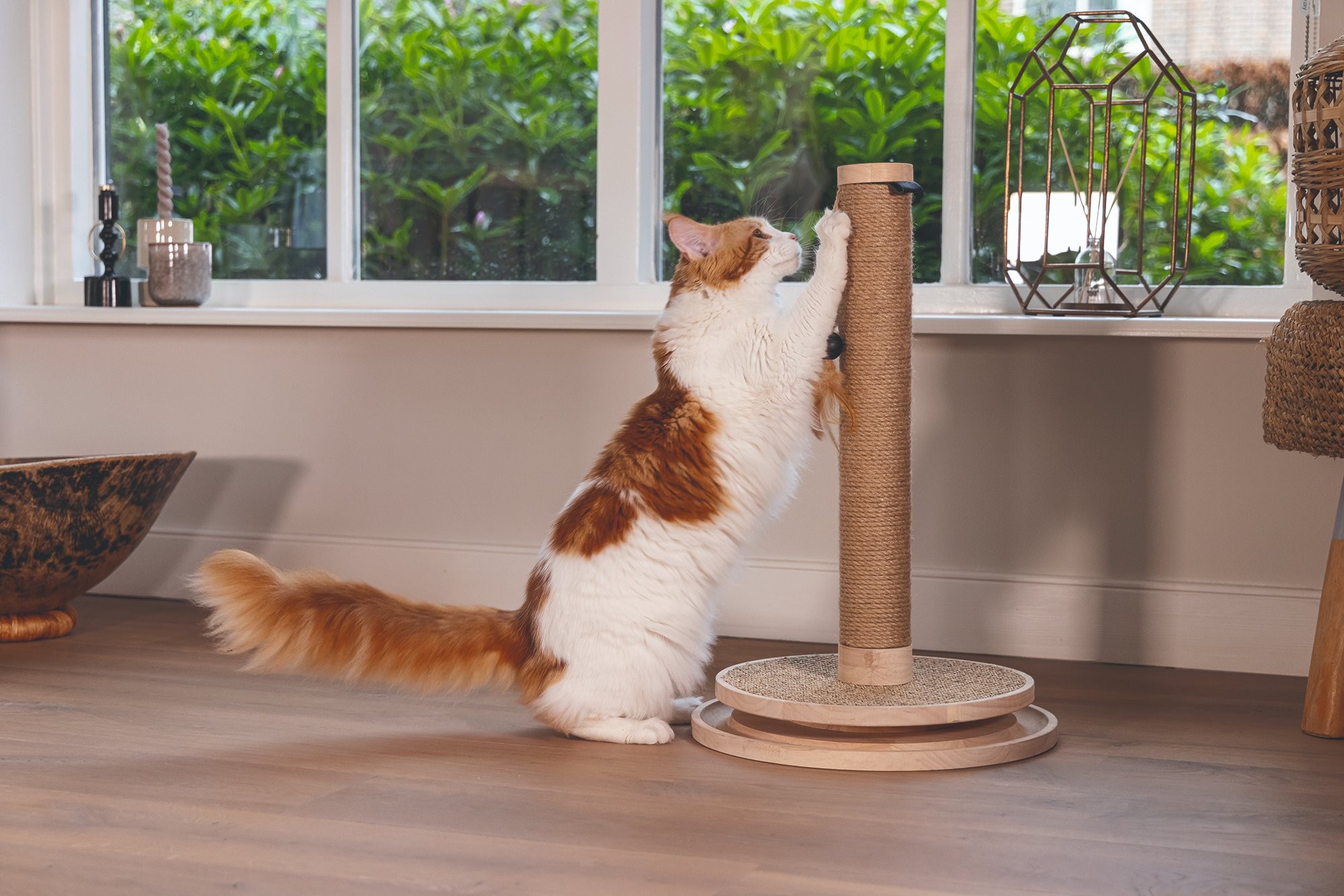 Škrabadlo v prírodných tónoch s hračkami. Kombinácia kaučukového dreva, juty a sisalu.