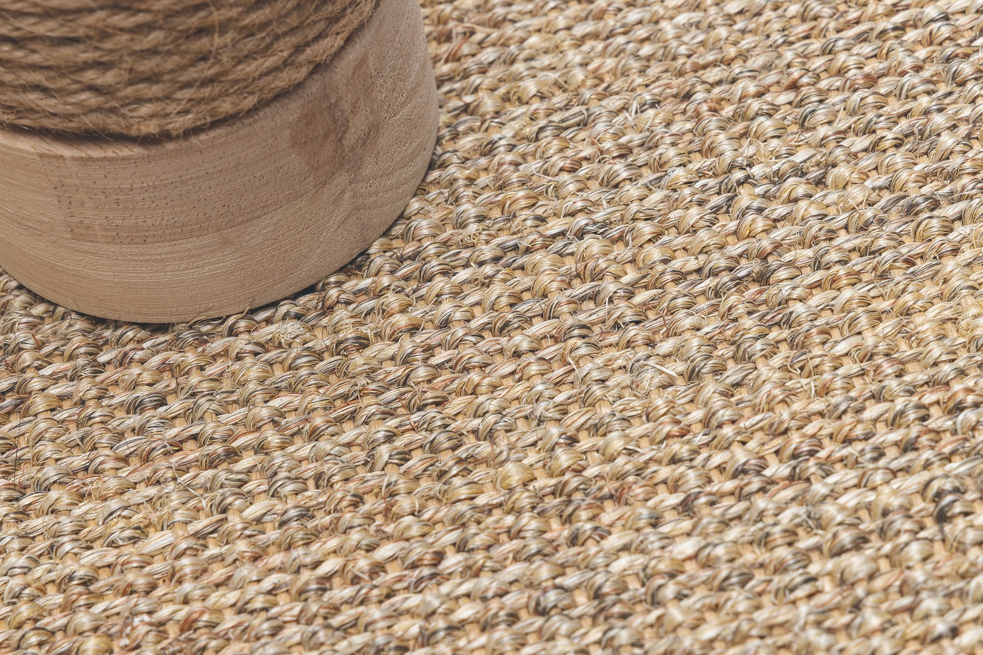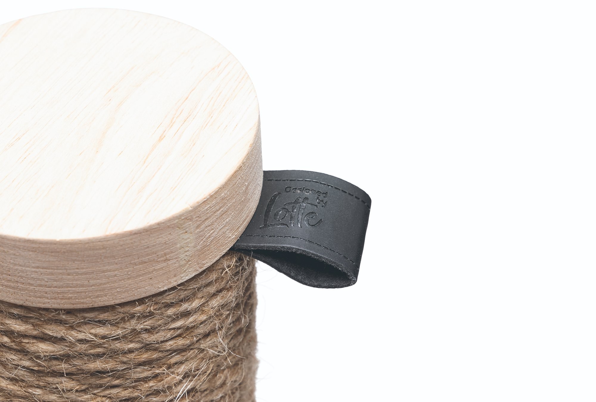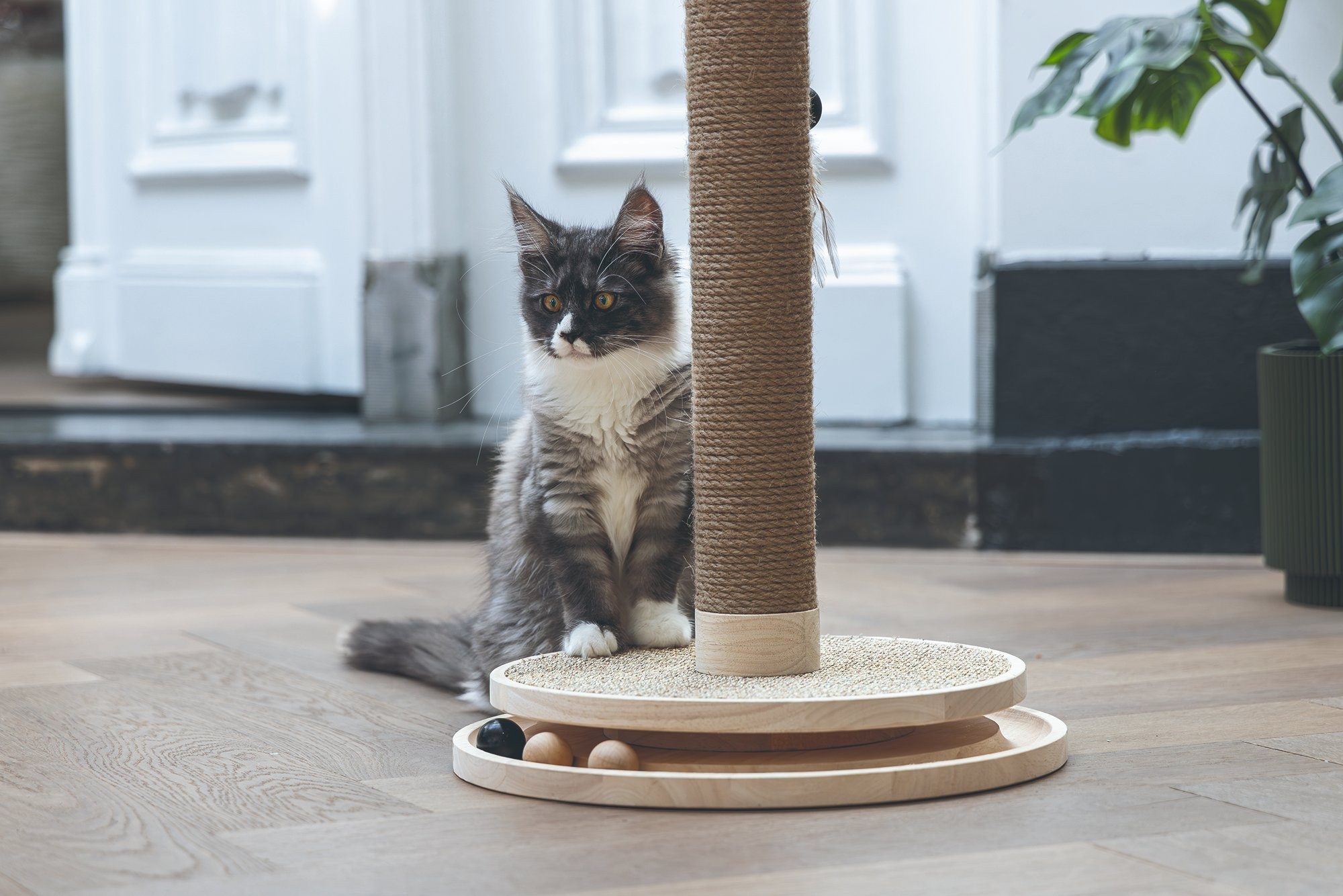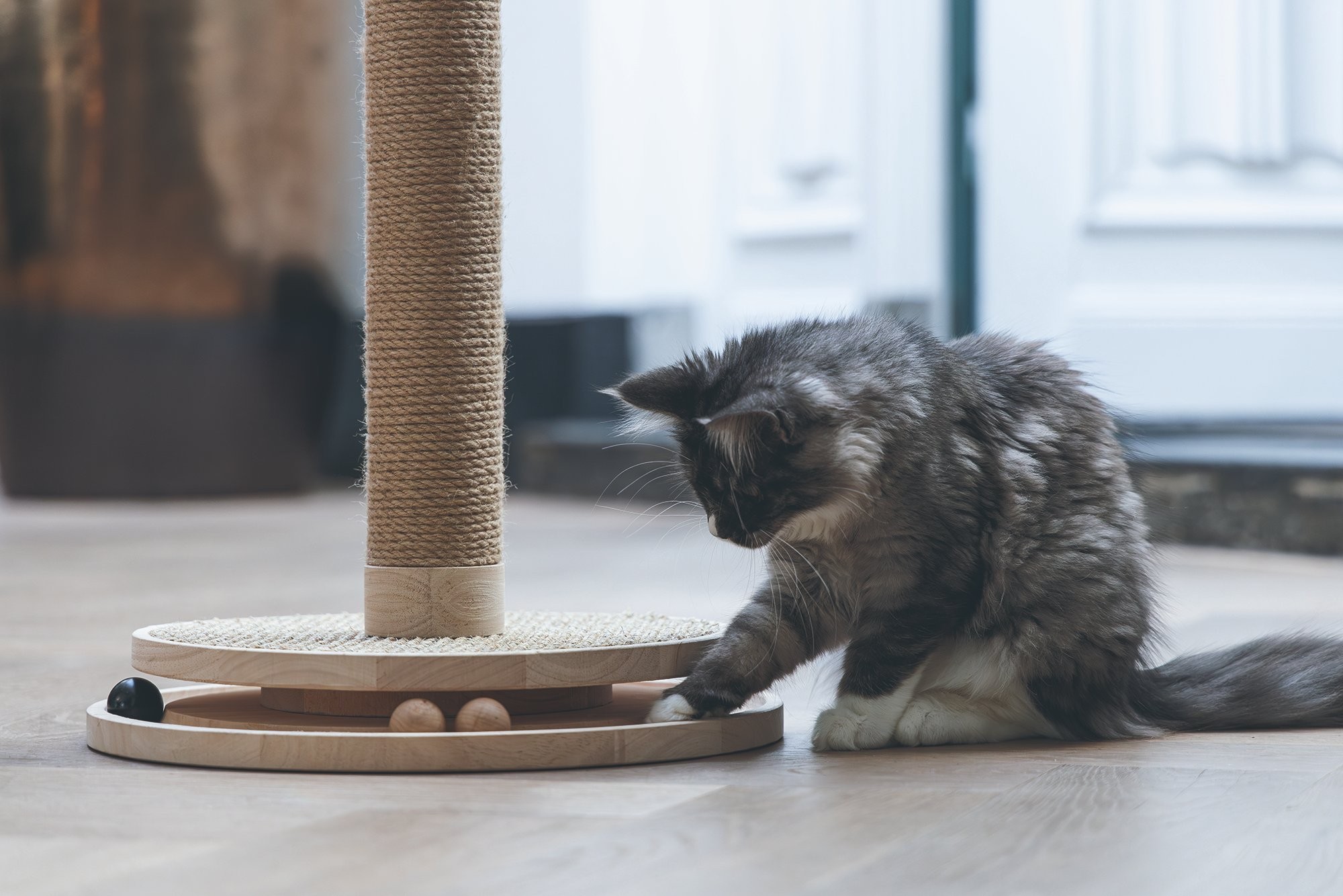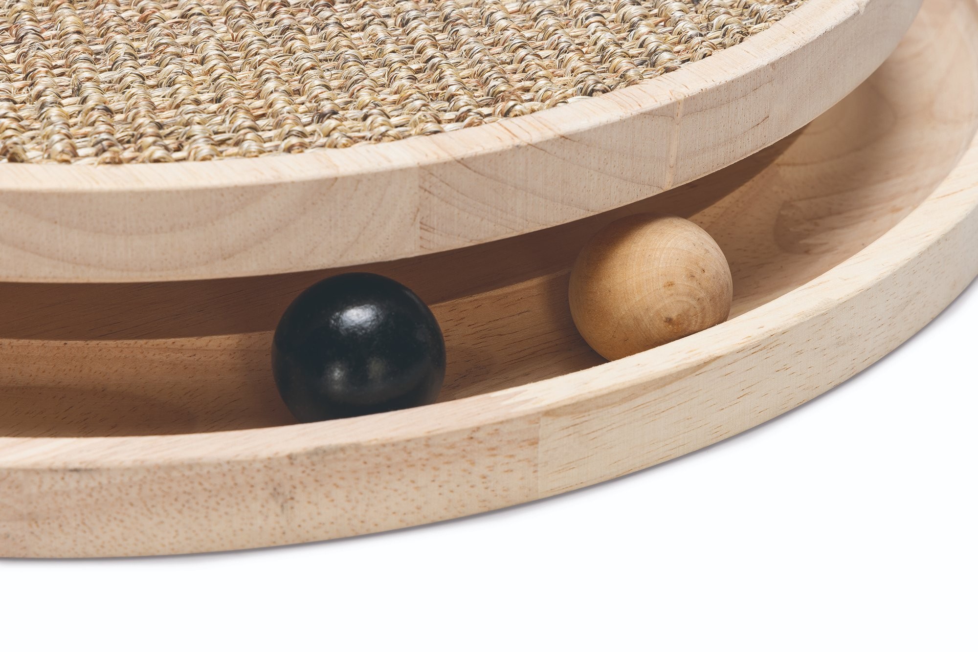 Škrabadlo v prírodných tónoch s hračkami. Kombinácia kaučukového dreva, juty a sisalu.