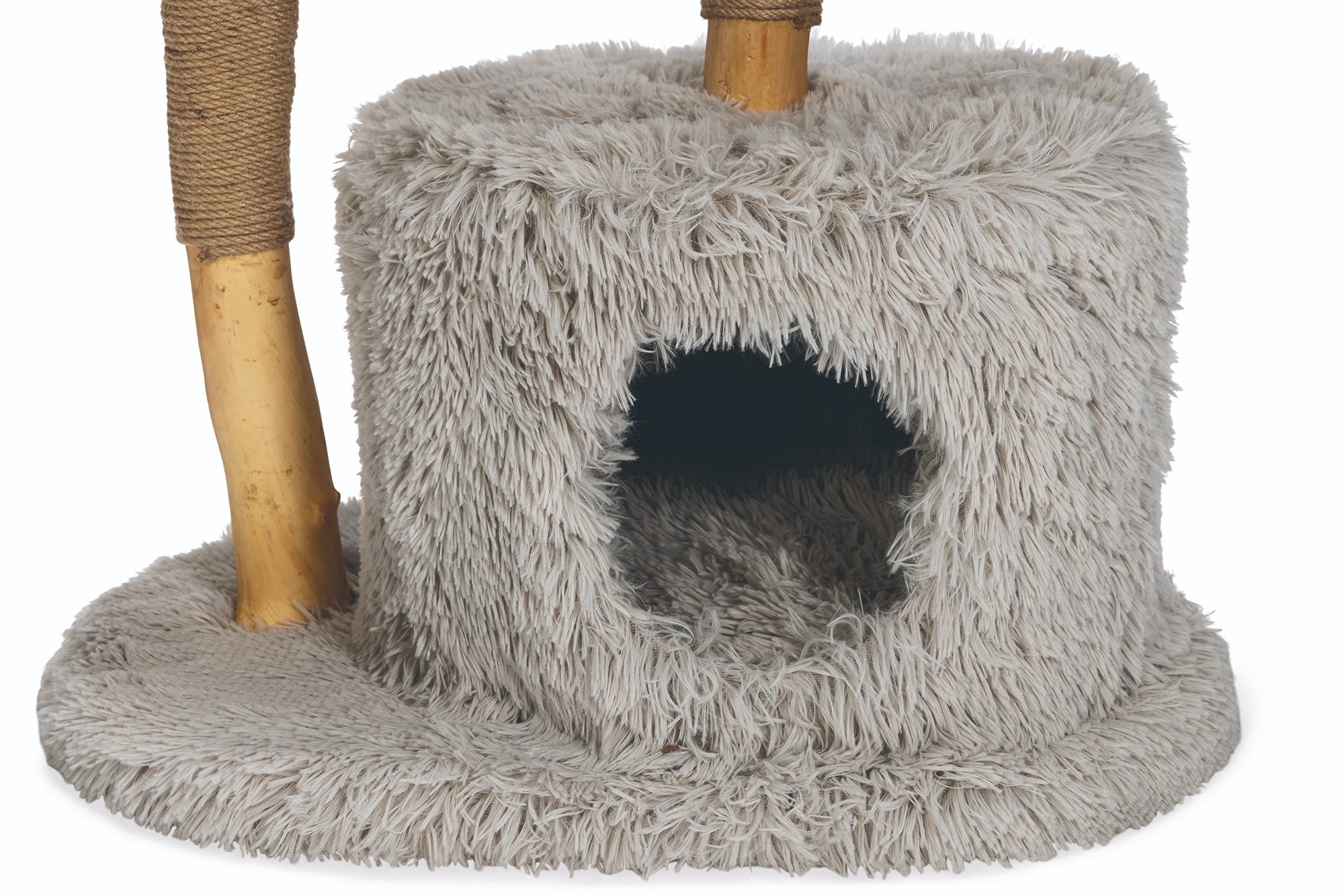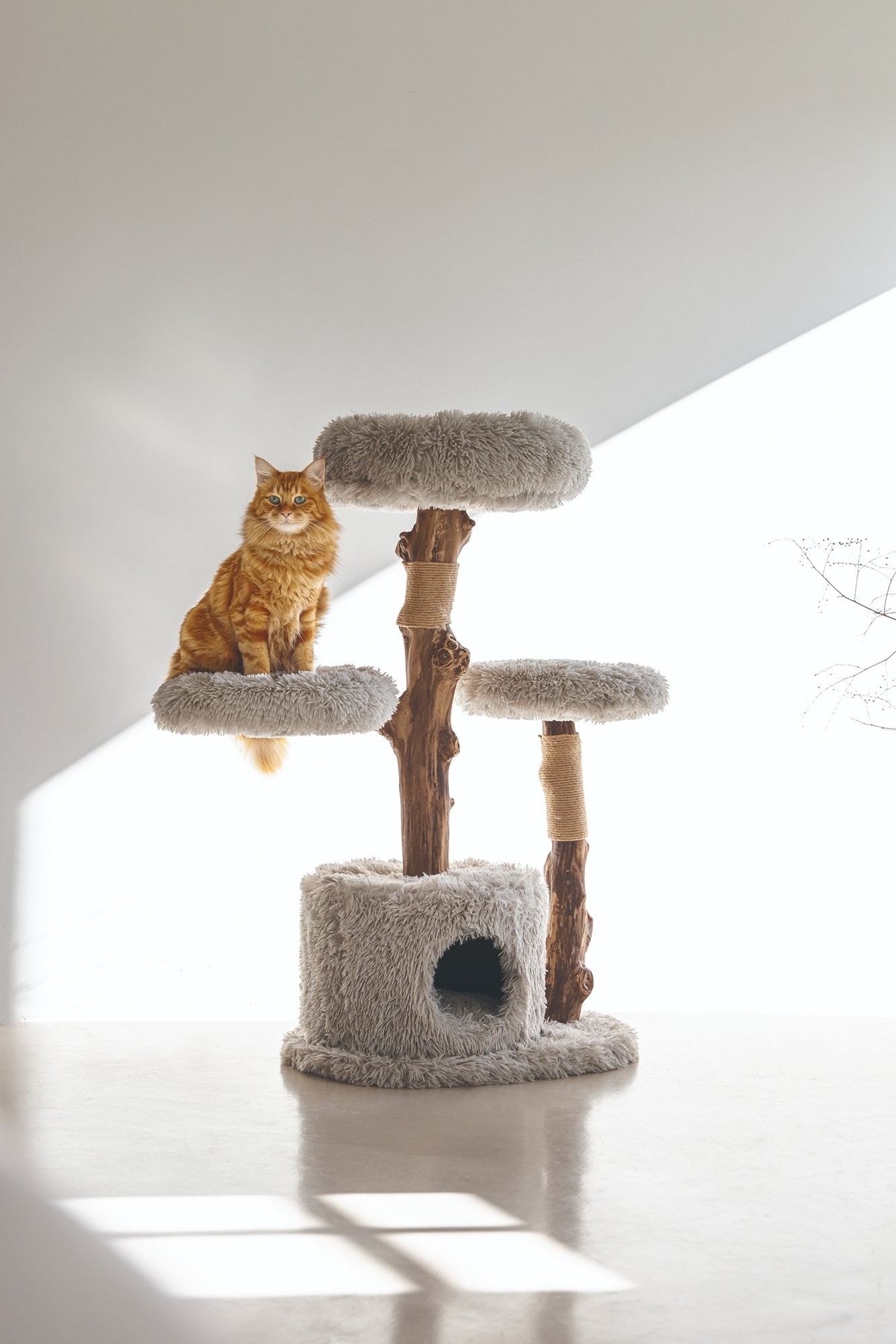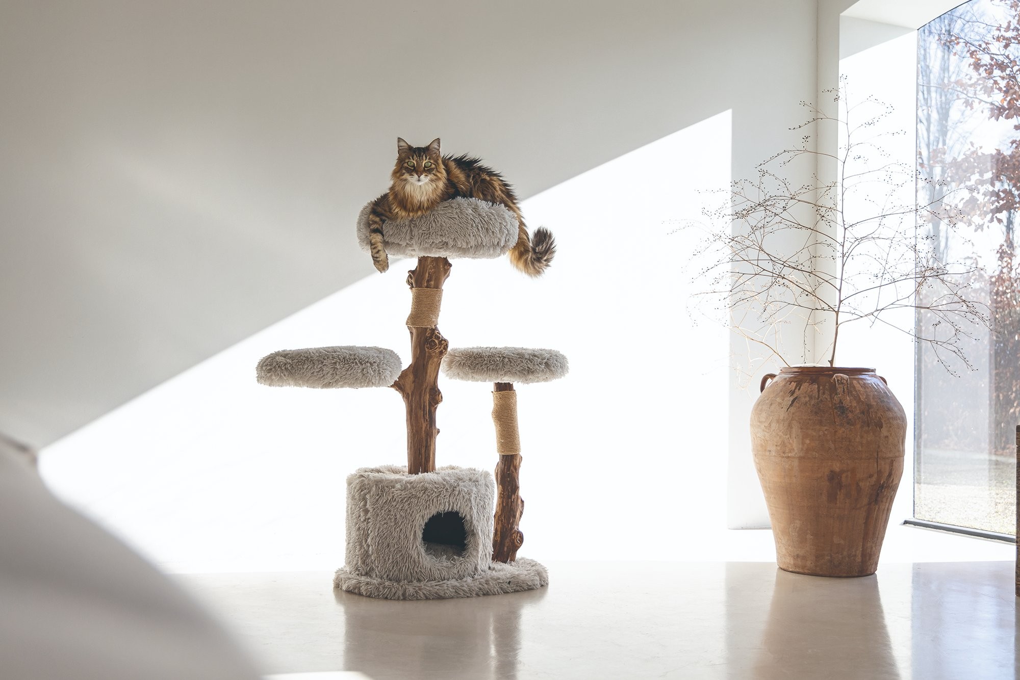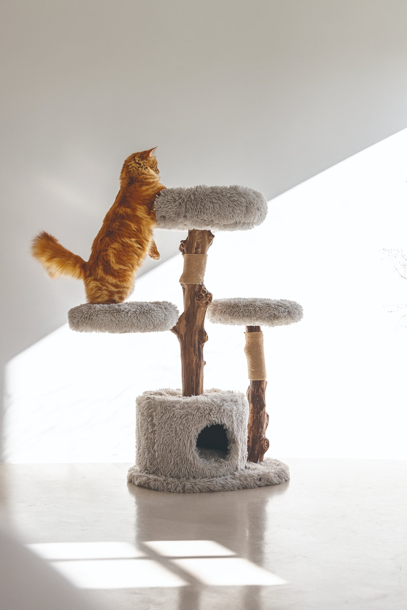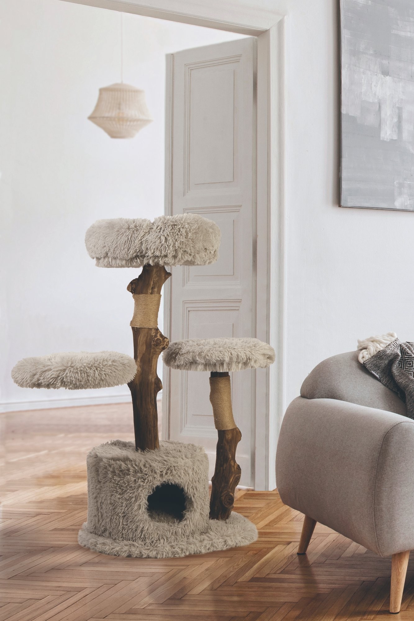 Škrabací strom s odpočívadlami a domčekom pre mačky.