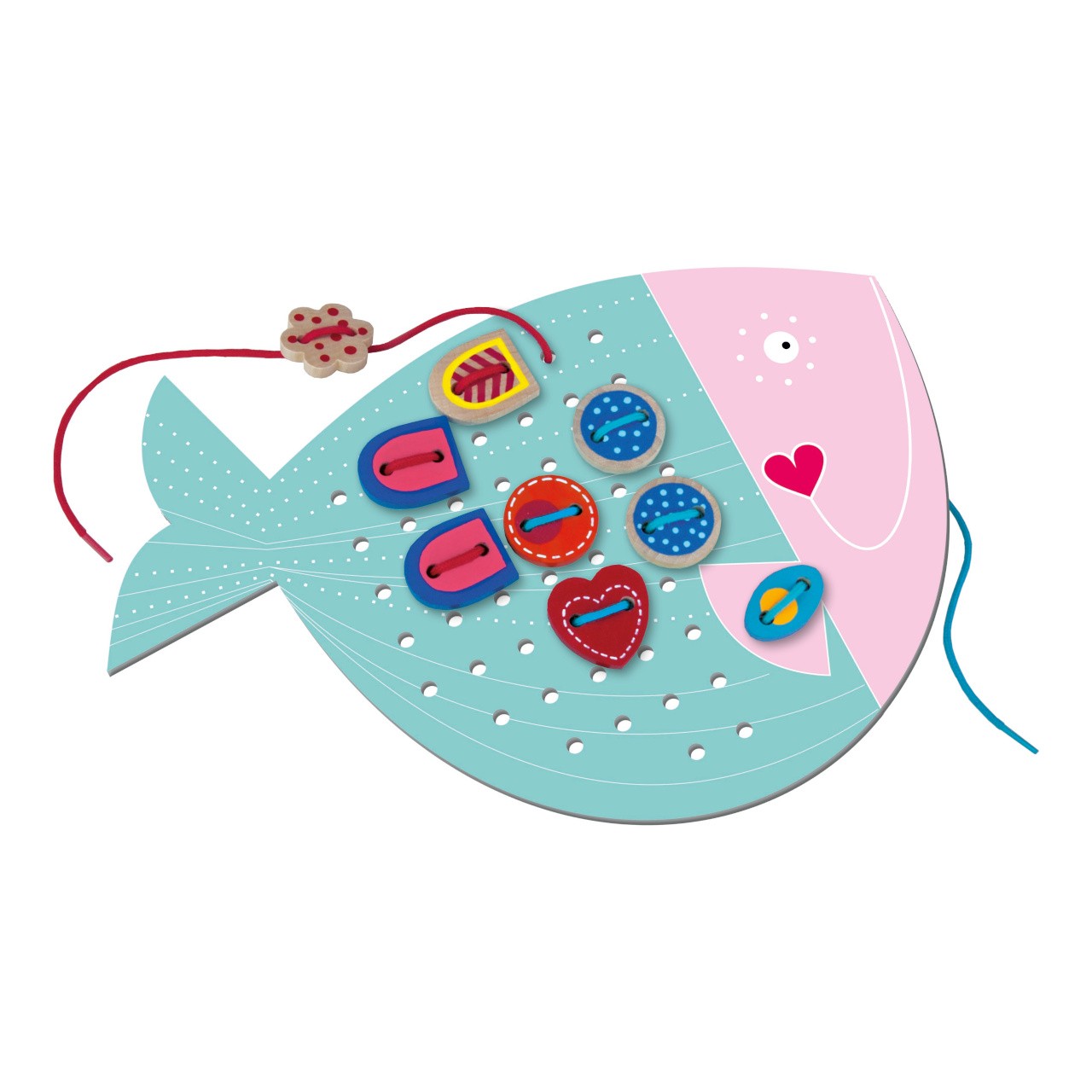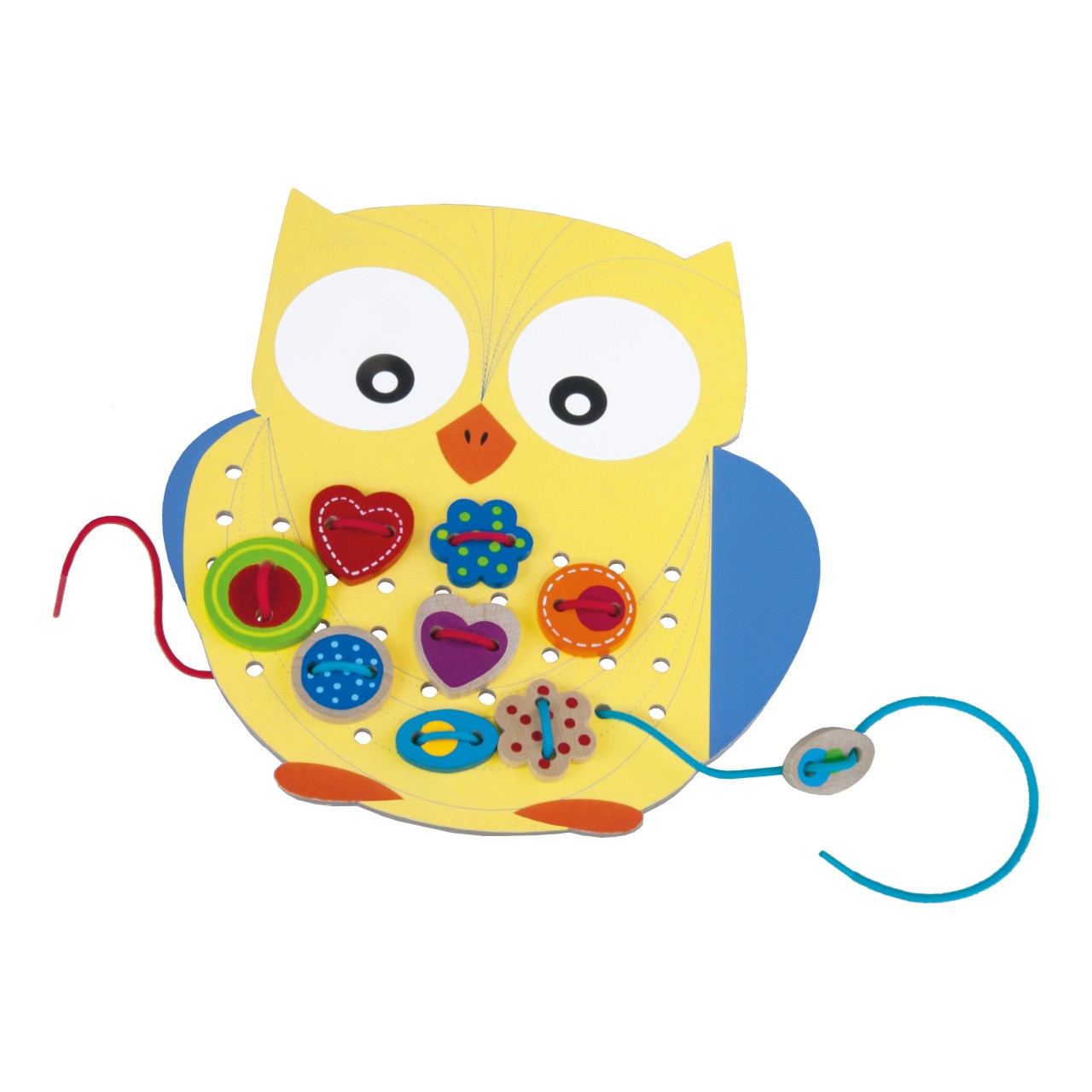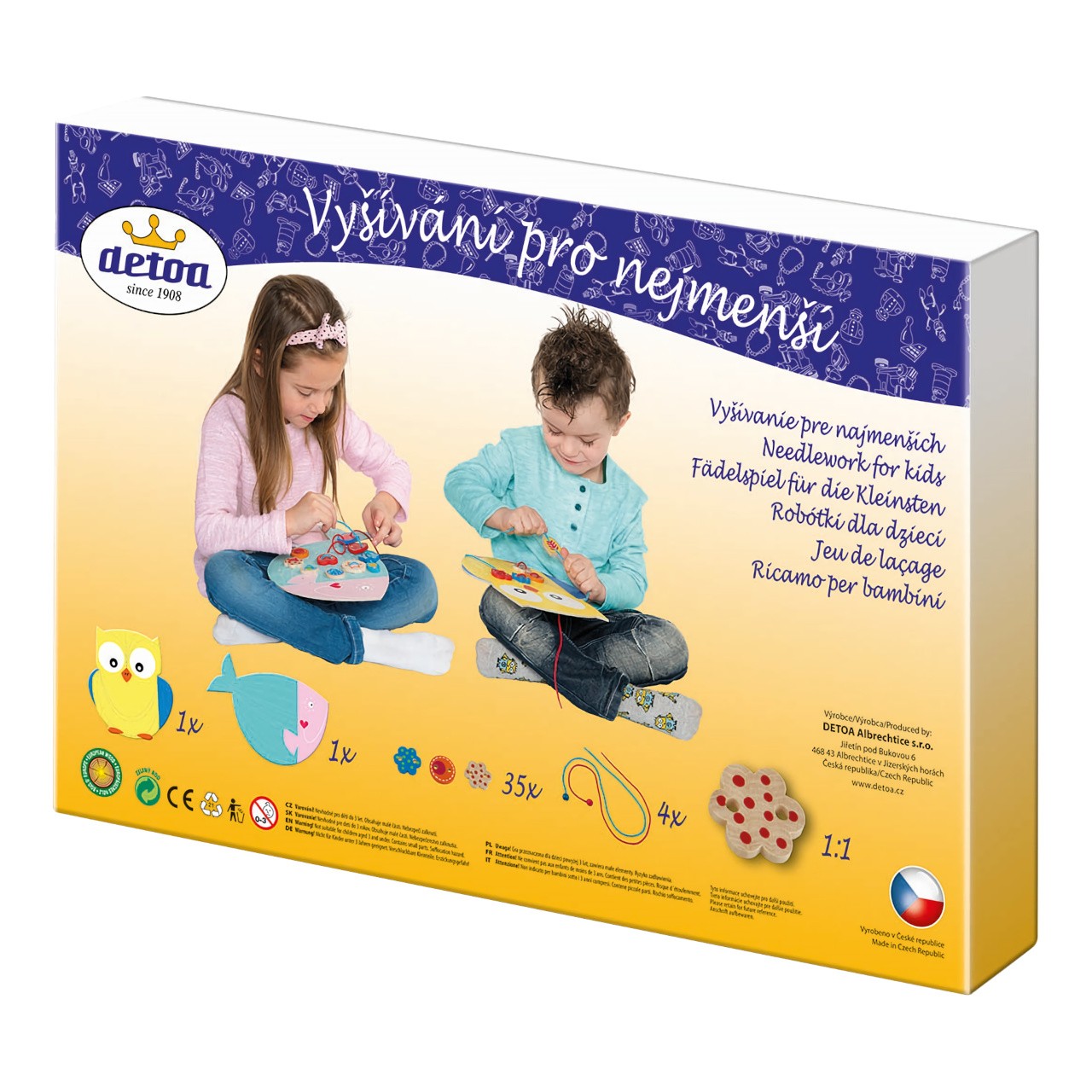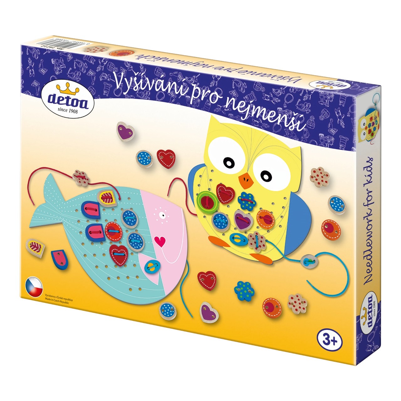 Oblíbená hračka pro rozvoj jemné motoriky rukou, fantazie, představivosti a také trpělivosti dětí. Balení obsahuje dvě krásné kartonové předlohy (velmi pevný materiál) sovu a rybičku, na kterou děti pomocí šňůrek přišívají dřevěné komponenty, 35 ks dřevěných komponentů s potiskem a 4 tkaničky. Hlavní vlastnosti: Vhodné pro holčičku ai pro chlapceVýrobek odpoví všem předpisům na bezpečnost hračekTestováno nezávislou laboratoříVýrobek je určen pro děti od 3 let