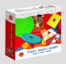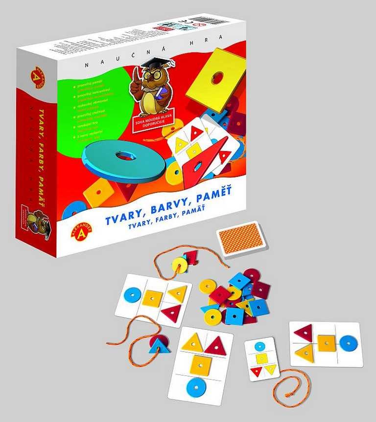 Zábavná naučná hra. Učí barvy a tvary, rozvíjí paměť, postřeh a koncentraci. Pro 2-4 hráče od 5 let. Na 55 kartách najdete vzory tvořené obrázce, které odpovídají tvarům plastových žetonů. Po chvilkovém prohlédnutí karty je třeba z žetonů složit zapamatovaný vzor. Ve druhé verzi hry musí její účastníci co nejrychleji navléct žetony na provázek. Jejich barva, tvar a počet se musí shodovat s kartou, kterou si hráč na krátkou chvilku prohlédl. Nečekaně zábavná hra, která učí barvy a tvary, rozvíjí paměť, postřeh a koncentraci. Skládej žetony různách tvarů a barev podle vzorové karty. Zapoj postřeh a paměť. Zaleží na každém detalu a rychlosti abys zvítězil! Při hře se s dětmi skvěle zabaví i celá rodina. - zábavné učení barev a tvarů - trénink soustředění, postřehu a paměti - 2 různé varianty hry Balení obsahuje: žetony–36 kusů, karty se vzory–55 kusů, provázky–4 kusy, podložky–4 kusy, český a slovenský návod
