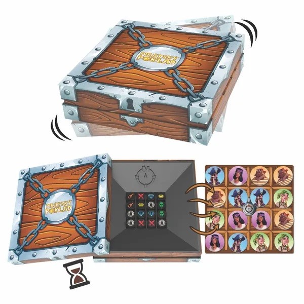 Jak dobrou mají piráti paměť? Inu, čím lepší paměť, tím větší kořist. Tak to alespoň chodí v zábavné postřehové hře Pirátský poklad. Čím více předmětů z truhly si zapamatujete, tím více kořisti z pokladu kapitána Černého psa vás za odměnu čeká. Dobrá paměť ovšem není jediným klíčem k úspěchu. Musíte být také dostatečně mazaní, abyste kořist uměli správně rozdělit a odnést si ty nejcennější kousky. Vítězem se stává ten, kdo posbírá za získaný poklad nejvyšší počet bodů. Balení obsahuje: truhla s pokladem16 kostek, deska s mřížkou24 žetonů pirátů, žeton klíče4 papoušci4 přehledové kartyskórovací tabulkapřesýpací hodinypravidla Hlavní vlastnosti: hra zaručí nejen zábavu, ale i napínavé zážitkyprocvičí paměť, postřeh, trpělivost i logické myšlenírozvíjí kreativitu a vyjadřovací schopnosti Dokumentace: návod ke hře Pirátský poklad CZ