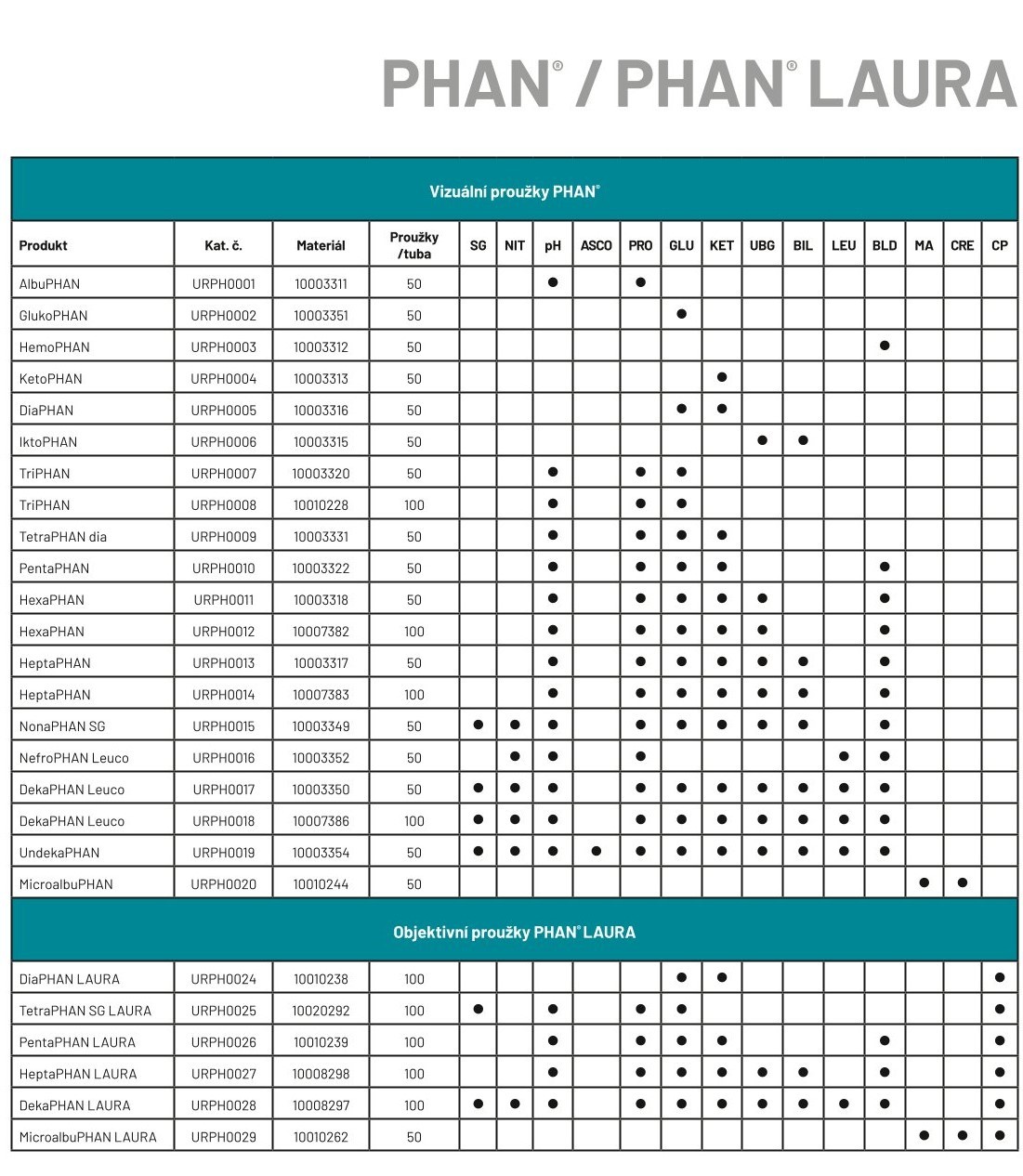 Sortiment PHAN zahrnuje diagnostické proužky určené pro semikvantitativní analýzu moče. Lze stanovovat až jedenáct klinicky významných analytů- glukóza, pH, bilirubin, urobilinogen, bílkoviny, dusitany, SG, leukocyty, ketony, krev a kyselina askorbová (vitamín C) objektivním i vizuálním postupem. Diagnostické proužky PHAN umožňují efektivní screening pň rutinním vyšetření pacienta a monitorování následné léčby. Hlavní oblasti, kde proužky PHAN odhalí počáteční příznaky, jsou onemocnění ledvin a urogenitálního traktu, onemocnění jater, metabolické a hemolytické poruchy. Výhodou výrobků je snadnost provedení vlastního stanoveni, rychlost získání výsledku (do 1-2 minut), vysoká diagnostická specificita a citlivost. Proužkyjsou určeny zejména pro laboratoře klinické chemie, ordinace odborných a praktických lékařů.