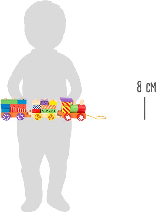 Vlak s mnoha skvělými barvami a vzory. Může změnit svůj vzhled pomocí barevných dřevěných bloků, které lze je jednoduše přemístit podle Vašich priorit Lokomotivu a dva vagóny lze vzájemně spojit a následně táhnout šňůrou. Hlavní vlastnosti: podporuje rovnováhu a koordinaci pohybůveselé barevné provedení i design