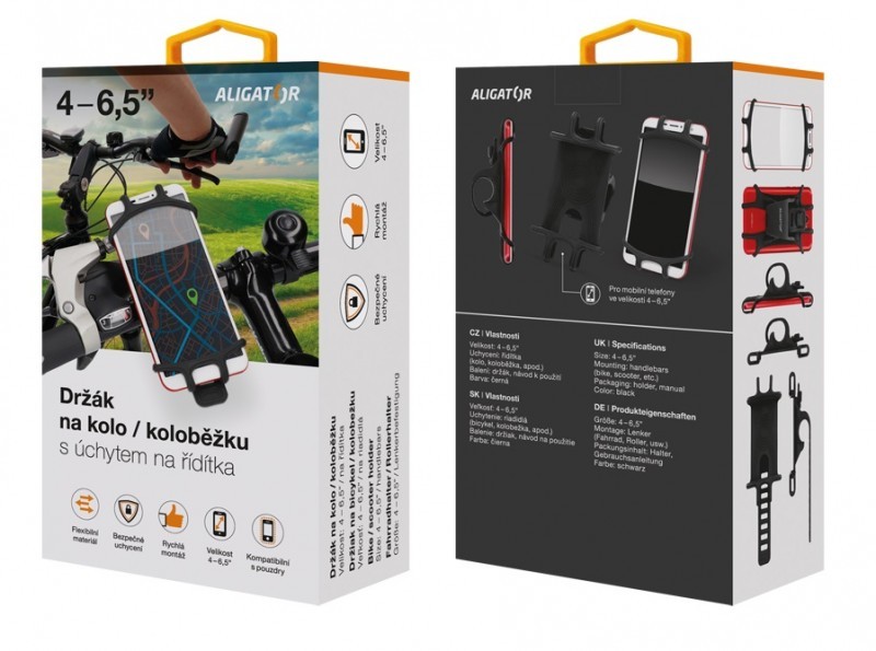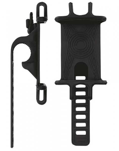 Univerzální držák na řídítka kola/koloběžky nebo kočárku z flexibilního gumového materiálu. Upevnění mobilního telefonu pomocí napínacích a zároveň šetrných gumiček. Spolehlivé a bezpečné uchycení mobilního telefonu ve velikosti 4-6,5“. Decentní minimalistické provedení, které nezabírá na řídítkách tolik místa. Dalšími hlavními přednostmi jsou například sportovní design nebo systém rychlofixace.