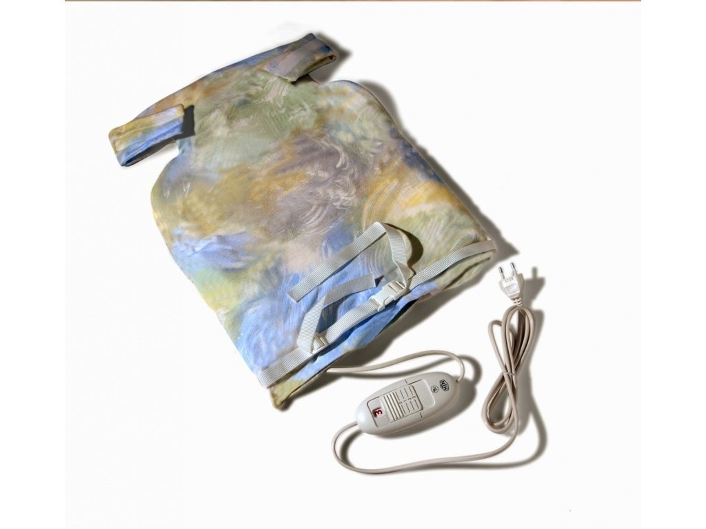 Zahřívací poduška je vyrobena z bavlny a připevňuje se pomocí suchého zipu na krk a páskem přes břicho.