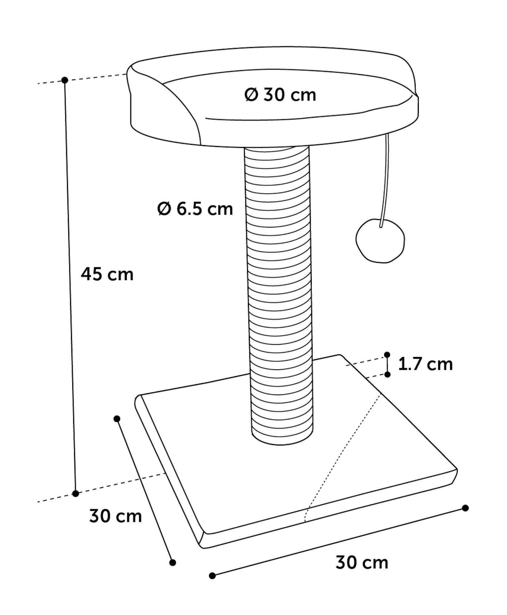 Doprajte svojej mačke útulné miesto na leňošenie, odpočinok a možnosť precvičiť si pazúriky. Stĺpik priemeru 6,5 cm je obmotaný jutovým lanom hrúbky 4 mm. Tu si Vaša mačka môže brúsiť pazúriky podľa ľubovôle. Navyše je tu loptička na hranie na povrázku a lákavý, mäkký, plyšový trón na podriemkavanie. Všetko je ladené do príjemných šedo-béžových odtieňov.