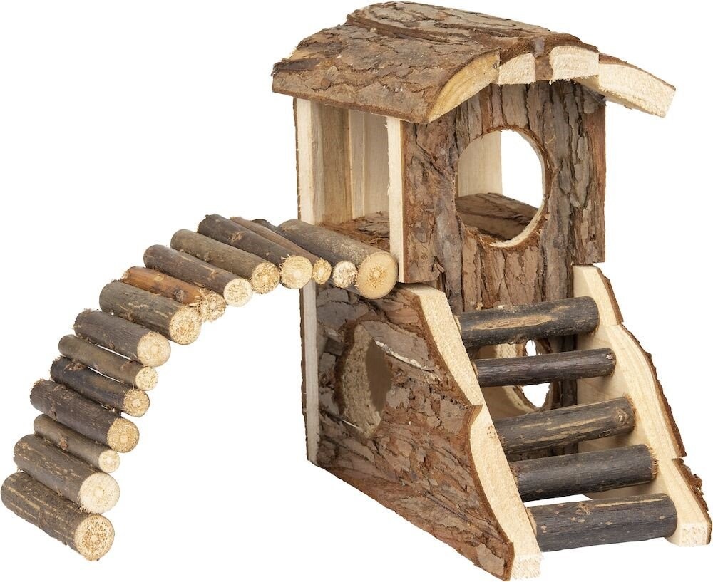 Drevený domček pre hlodavce vyrobený z prírodných materiálov v podobe domčeka so schodíkmi a mostom. Celý popis