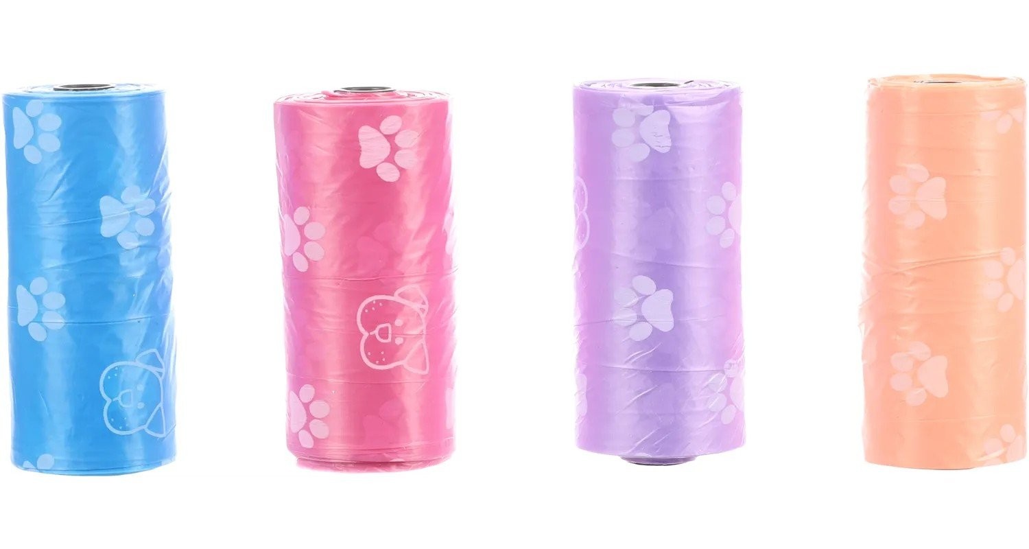 Krásne farebné sáčky na psie exkrementy. V praktickej roličke. Vhodné na doplnenie tašiek na psie exkrementy.