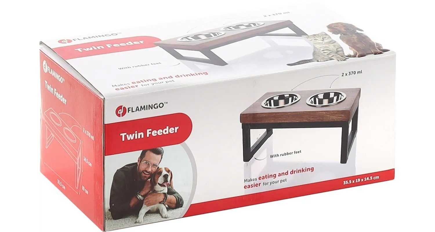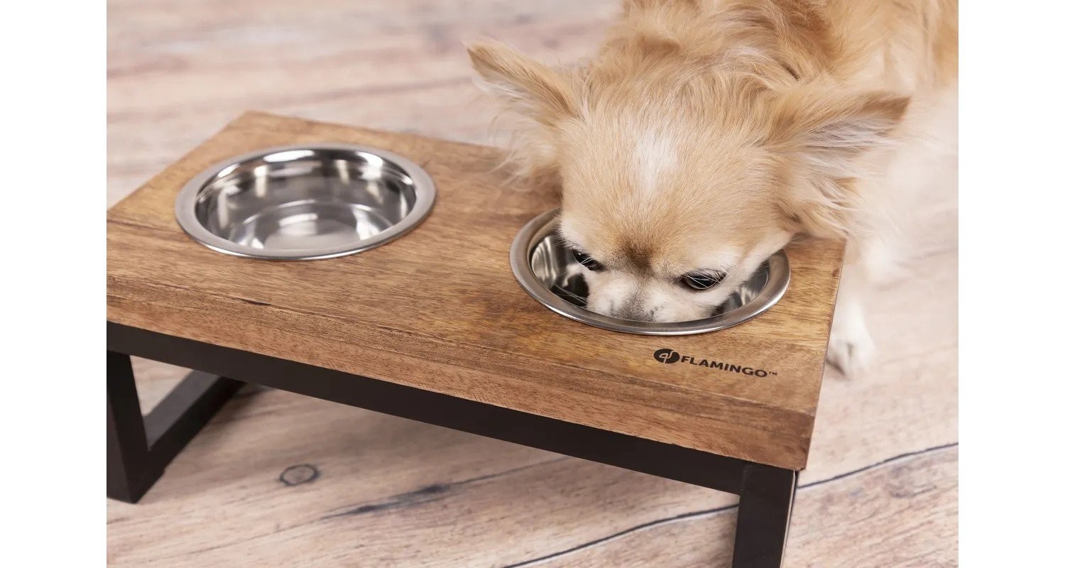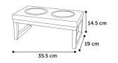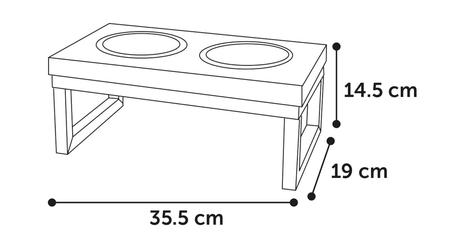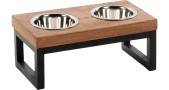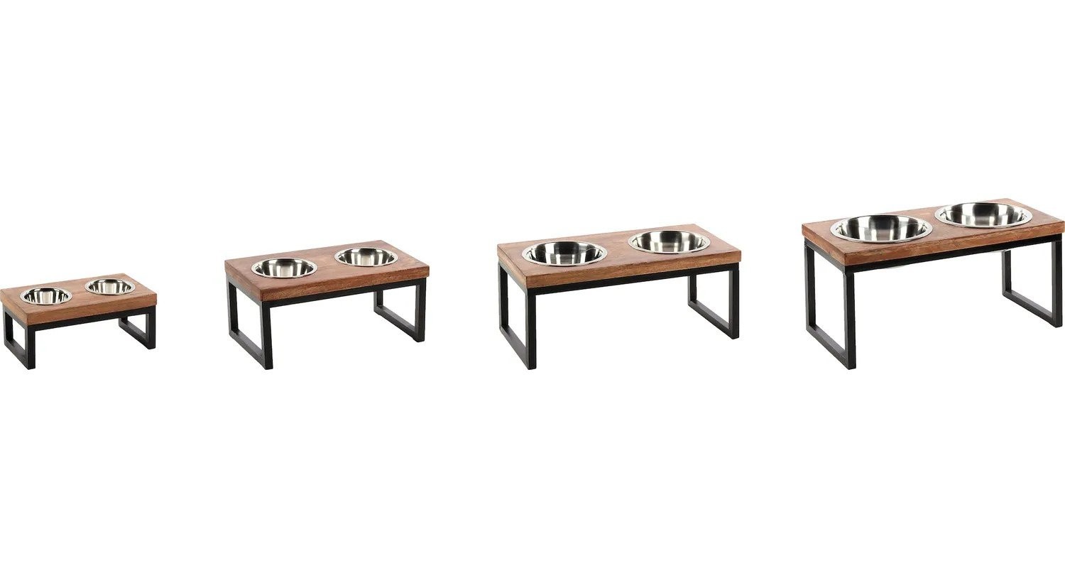 Stabilná kovová konštrukcia s čiernou povrchovou úpravou a ochranou proti poškrabaniu podlahy. Doska z mangového dreva s 2 vyberateľnými miskami. Nerezové misky sa dajú umyť v umývačke. Pre mačky a psy všetkých veľkostí a plemien. Určené pre vnútorné použitie.