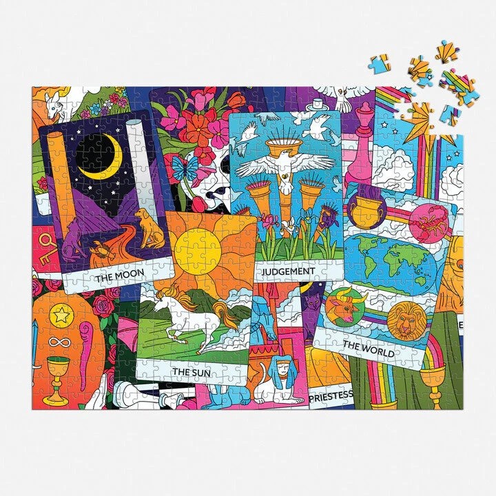Oboustranné puzzle zobrazuje tarotové karty, které představují životní lekce a témata. Dílky puzzle jsou na jedné straně matné a na druhé lesklé pro snadnější skládání. Puzzle je baleno v pevné krabici, pro opětovné použití a skladování. Ideální jako dárek. Autor obrázku je Michelle Berlin. Puzzle jsou vyrobeny za použití významného podílu recyklovaného papíru a nabízí špičkový potisk nezávadnými barvami. Jsou opatřeny matnou povrchovou úpravou, která zajišťuje za všech okolností věrné podání detailů i barev. Jejich zadní strana je potažena hladkým, na dotek příjemným povrchem, díky němuž se při skladování rozloženého puzzle netvoří prach. Spolu s pečlivě zabalenými dílky naleznete v balení také letáček s návodným obrázkem, který zpravidla obsahuje další informace o tvůrcích a pozadí vzniku díla. Dodáváno v mimořádně pevné a poutavě zpracované kartonové krabičce vyrobené z recyklovaného kartonu a udržitelně získaných materiálů s certifikací FSC®. Hlavní vlastnosti: 500 precizně vyřezaných dílkůvyrobeno s použitím recyklovaných a udržitelně získaných materiálůpečlivě vybraný motiv od renomovaných tvůrců a umělcůpotisk a provedení nejvyšší kvalityobsahuje návodný obrázek
