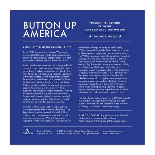 500dílné rodinné puzzle zobrazuje fotografii placek politické kampaně z americké historie. Puzzle je baleno v pevných krabicích s matným povrchem. Umělec Busy Beaver Button MuseumÊ. Hlavní vlastnosti: Obsahuje 500 dílkůPotištěno netoxickými inkoustyPrémiová kvalita puzzleJednotlivé dílky do sebe přesně pasujíRozvíjí logické myšlení a motoriku