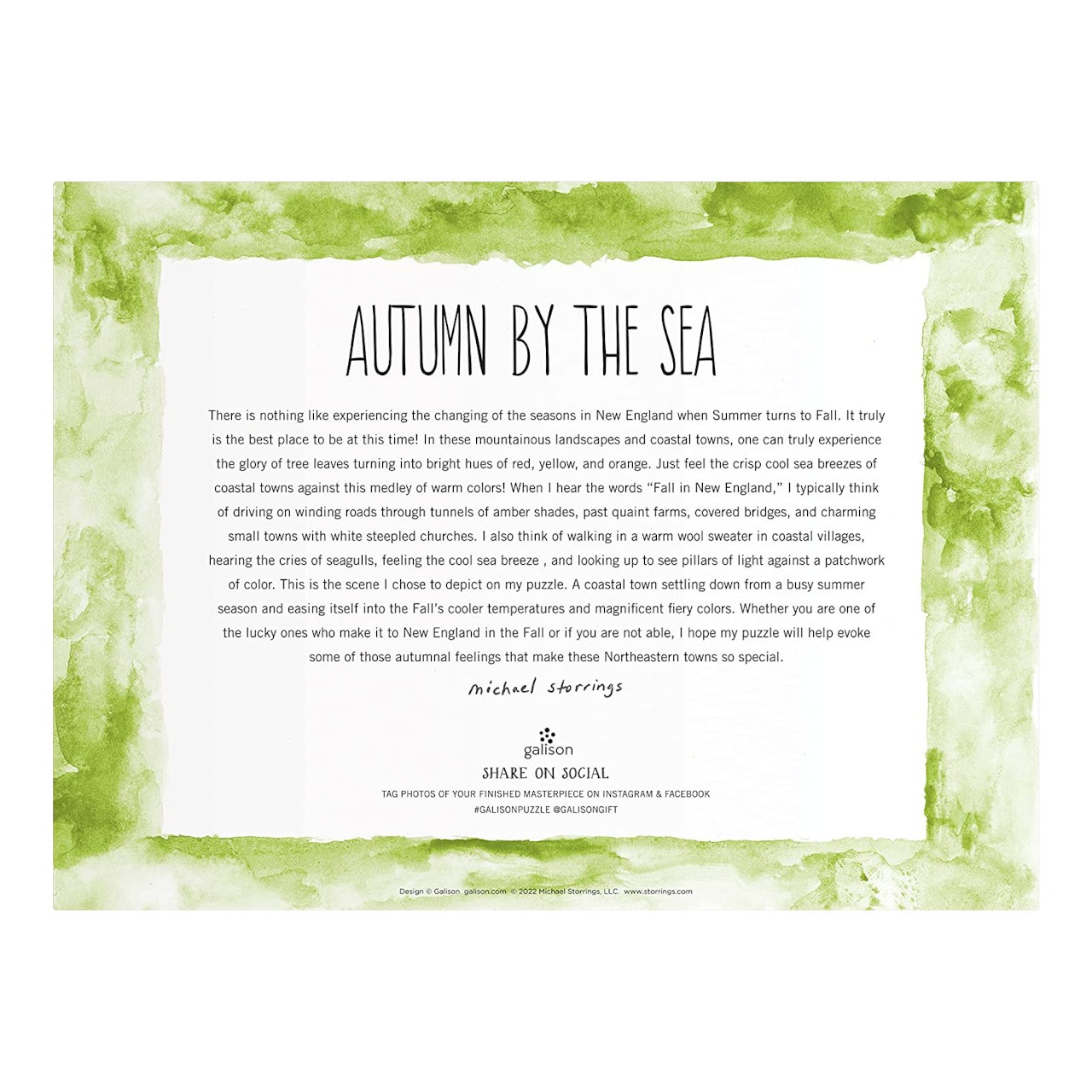 Přáli byste si zažít první podzimní dny v přímořském městečku v Nové Anglii? S jedinečným puzzle můžete kouzelnou atmosféru tohoto období a místa mít doma! Hřejivé odstíny červené, oranžové a žluté Vám pomohou se příjemně uvolnit a nechat se unášet vlastní fantazií. Autorem obrázku je cenami ověnčený designér a ilustrátor Michael Storrings. Puzzle Galison jsou vyrobeny za použití významného podílu recyklovaného papíru a nabízí špičkový potisk nezávadnými barvami. Jsou opatřeny matnou povrchovou úpravou, která zajišťuje za všech okolností věrné podání detailů i barev. Jejich zadní strana je potažena hladkým, na dotek příjemným povrchem, díky němuž se při skladování rozloženého puzzle netvoří prach. Spolu s pečlivě zabalenými dílky naleznete v balení také letáček s návodným obrázkem, který zpravidla obsahuje další informace o tvůrcích a pozadí vzniku díla. Dodáváno v mimořádně pevné a poutavě zpracované kartonové krabičce vyrobené z recyklovaného kartonu a udržitelně získaných materiálů s certifikací FSC®. Hlavní vlastnosti:1000 precizně vyřezaných dílkůvyrobeno s použitím recyklovaných a udržitelně získaných materiálůpečlivě vybraný motiv od renomovaných tvůrců a umělcůpotisk a provedení nejvyšší kvalityobsahuje návodný obrázek