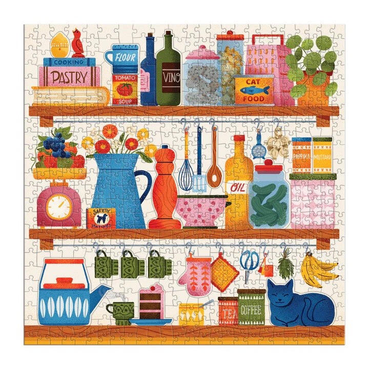 Puzzle zobrazuje ilustrovanou polici s kuchyňskými potřebami. Obsahuje i 15 zábavných tvarovaných dílků, které úhledně zapadají do puzzle. Puzzle je baleno v pevné krabici, pro opětovné použití a skladování. Ideální jako dárek. Puzzle jsou vyrobeny za použití významného podílu recyklovaného papíru a nabízí špičkový potisk nezávadnými barvami. Jsou opatřeny matnou povrchovou úpravou, která zajišťuje za všech okolností věrné podání detailů i barev. Jejich zadní strana je potažena hladkým, na dotek příjemným povrchem, díky němuž se při skladování rozloženého puzzle netvoří prach. Spolu s pečlivě zabalenými dílky naleznete v balení také letáček s návodným obrázkem, který zpravidla obsahuje další informace o tvůrcích a pozadí vzniku díla. Dodáváno v mimořádně pevné a poutavě zpracované kartonové krabičce vyrobené z recyklovaného kartonu a udržitelně získaných materiálů s certifikací FSC®. Hlavní vlastnosti: 500 precizně vyřezaných dílkůvyrobeno s použitím recyklovaných a udržitelně získaných materiálůpečlivě vybraný motiv od renomovaných tvůrců a umělcůpotisk a provedení nejvyšší kvalityobsahuje návodný obrázek