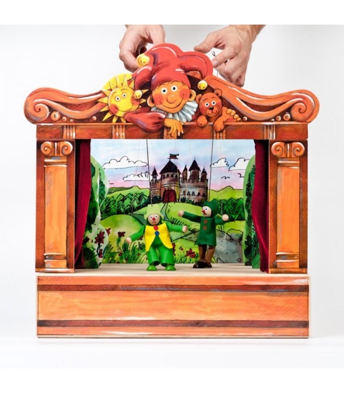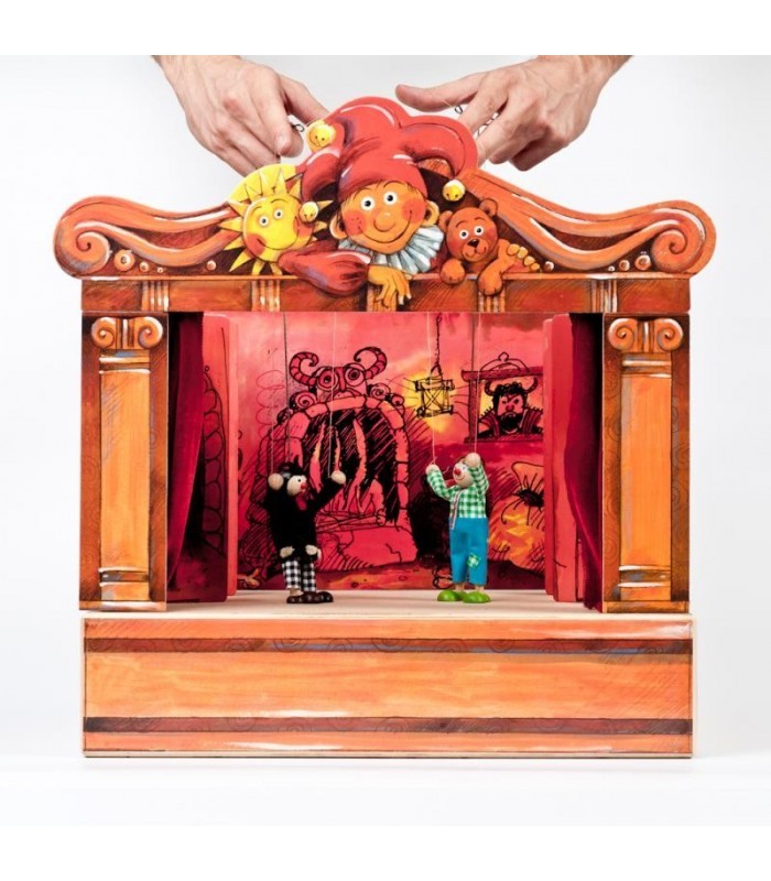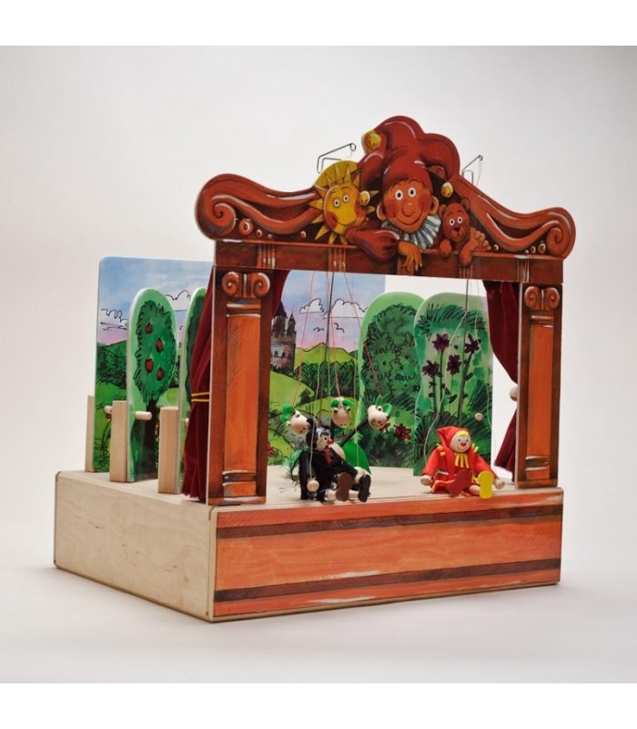 Půvabné dřevěné loutkové divadlo pro vaše děti. Ponořte se spolu s dětmi do světa nejznámějších českých pohádek. Vhodné pro děti od 3 let. Krásně propracované dřevěné loutkové divadlo s jednotlivými loutkami, probudí u Vašich dětí fantazii, posílí paměťové a výrazové schopnosti. Velikost loutkového divadla: 46 x 41 x 32 cm Velikost loutky: 12-15 cm Sestava obsahuje dřevěnou krabici, 8 dřevěných loutek, 4 scény, proscenium s veselým kašpárkem a oponu. Loutky se mohou lišit v barevných detailech. Obsahuje oboustranné kulisy: Na zámku / Před zámkem U jeskyně / V pekle Obsahuje loutky: Král Ferdinand Královna Alžběta Princezna Anička Princ Slavomír Tříhlavý drak Čertík Bruno Čaroděj Vilém Kašpárek Celá loutková sestava je zabalena v praktickém dřevěném kufříku s posuvným víkem. Hlavní vlastnosti: Dřevěné divadlo s 2 oboustrannými kulisami a 8 loutkamiRučně vyráběné loutkyRozměry hlavní scény jsou 40x23 cm, rozměry bočních kulis jsou 9,5x23 cmDivadlo lze rozšířit o další loutky a kulisy