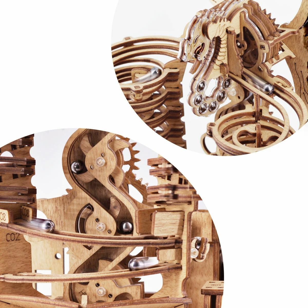 DIY sada dřevěných modelů Mramorové bludiště s nekonečným cyklem 260 dílů a 15 běžících kuliček Doba montáže: cca 6 hodin Rozměr: 18,2 x 21,5 x 12 cm Ideální dárek pro dospělé a teenagery ve věku 14+ Celý popis