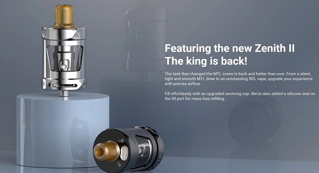Prvotřídní elektronický Grip v kombinaci s inovovaným Clearomizérem Zenith II. Na baterii typu 18650, Výstupní výkon: 6 - 80 W ; 20 - 100 Hz, Výstupní režimy: FØ / POWER (Wattage, Voltage), Podporovaný odpor: 0,1 - 3,5 ohm, Materiál: zinková slitina + nerezová ocel, Dobíjení: USB-C port (5V / 1,7A), Závit: 510. Objem clearomizéru: 5,5 ml, který je hvodný jak pro MTL, tak i DL styl vapování. Výrobce Innokin. Celý popis