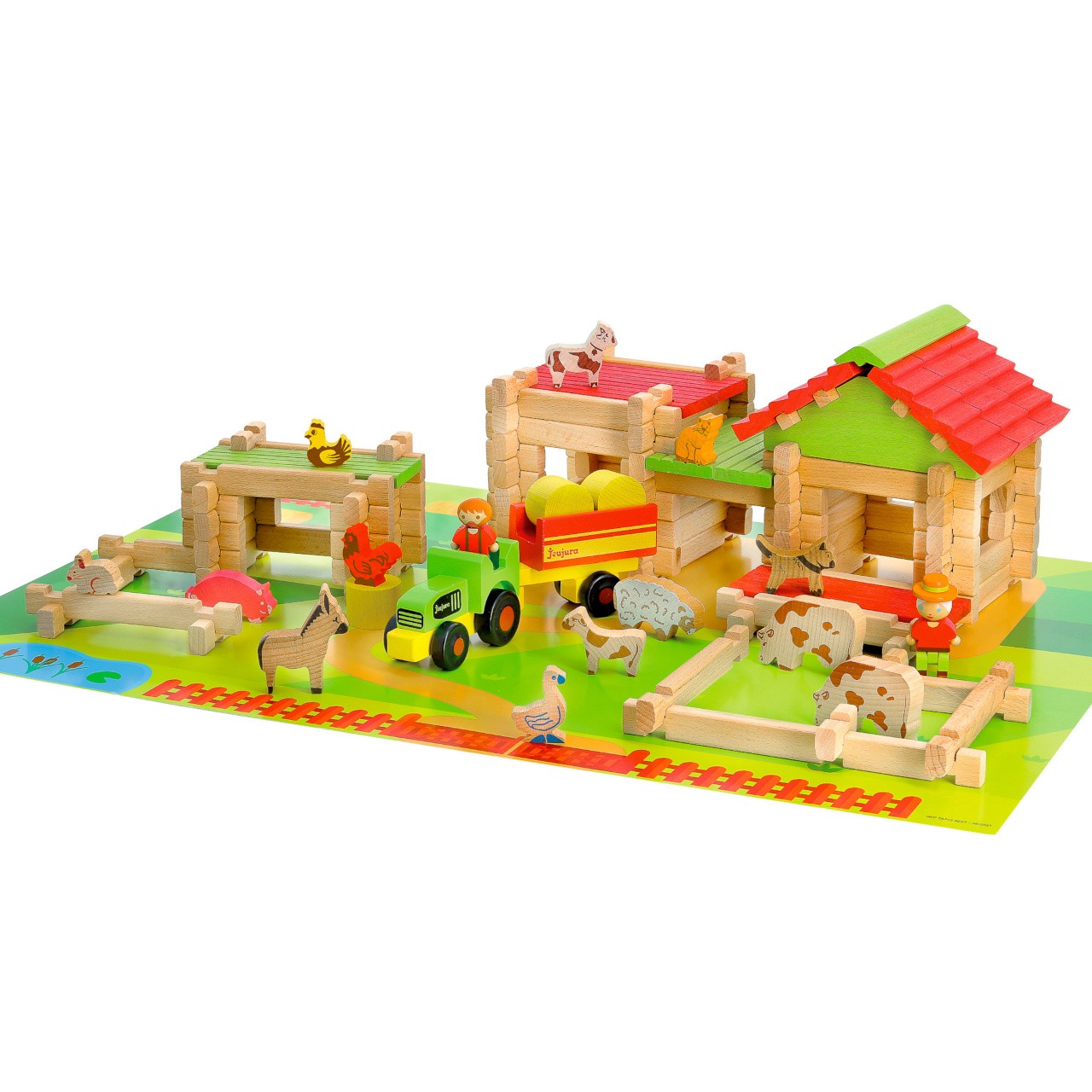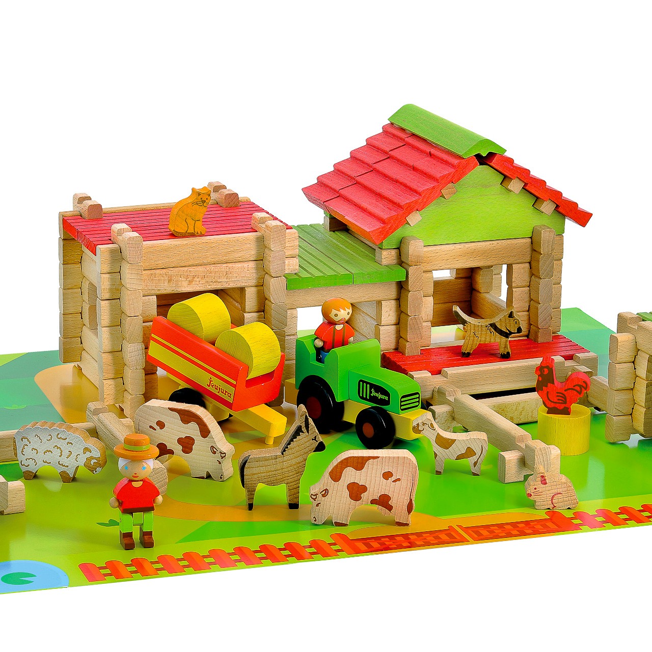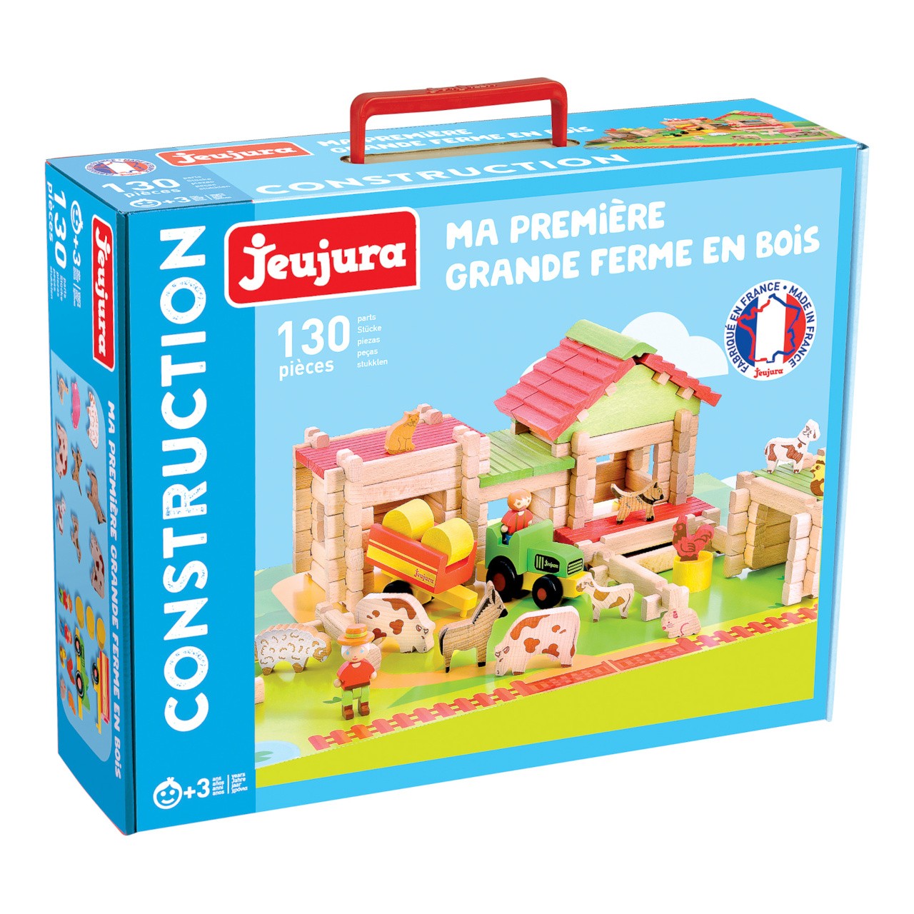Dřevěná stavebnice, která seznámí malé stavitele se životem na farmě, stane se ozdobou dětského pokoje. Stavebnice Jeujura Constructions mají dlouhou tradici a patří mezi klasické francouzské hračky. Nabízí série tématicky věnované chaletám, domkům a farmám, ale také divokému západu a středověku. Dají se mezi sebou volně kombinovat a k řadě z nich je také nabízeno příslušenství, figurky a vozidla. Jsou vyráběny ve Francii, z masivního bukového a borovicového dřeva francouzského původu. Dílky stavebnic jsou ošetřeny výhradně za použití barev a laků na bázi vody. Každá sada je balena v praktickém lepenkovém kufříku potištěném rostlinnými inkousty a součástí balení je snadno pochopitelný návod. Hlavní vlastnosti: 130 dílků z masivního dřeva a podložkapraktické balenívyrobeno ve Francii