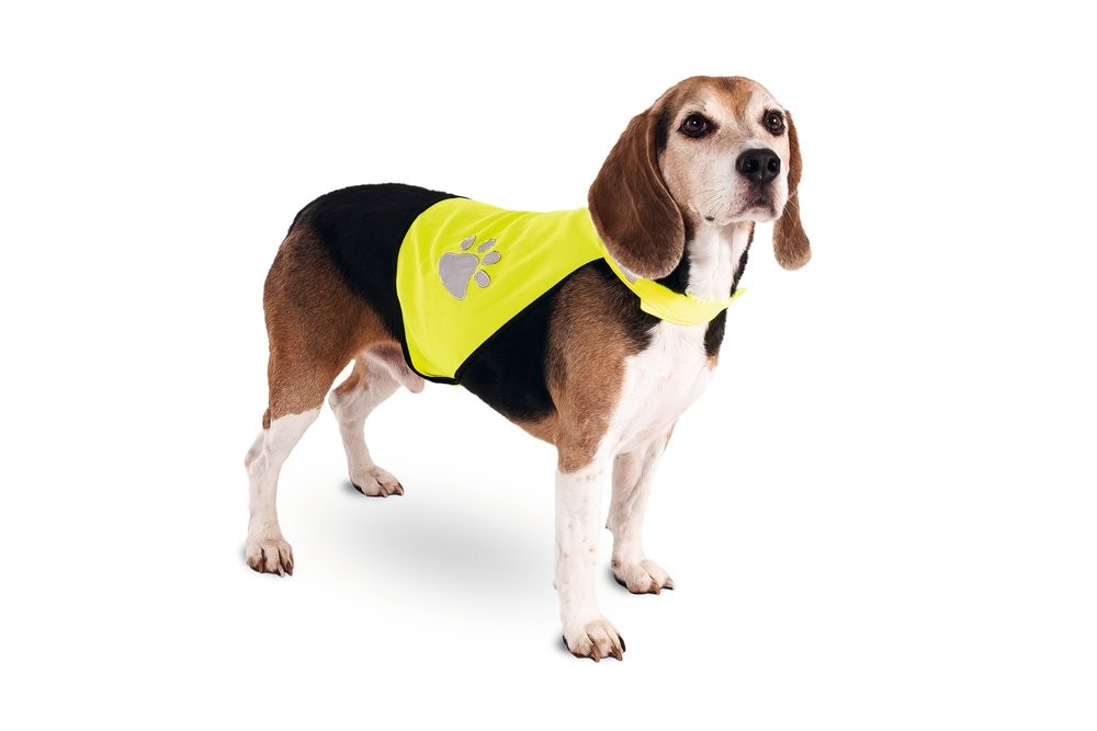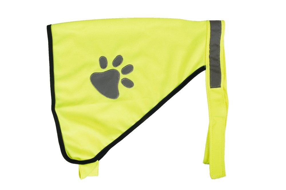 Bezpečnostná vesta s reflexnými prvkami pre psy s motívom labky. Zapínanie na suchý zips. Veľkosť M. Celý popis