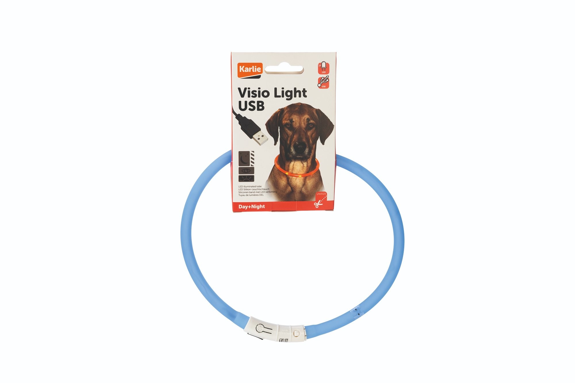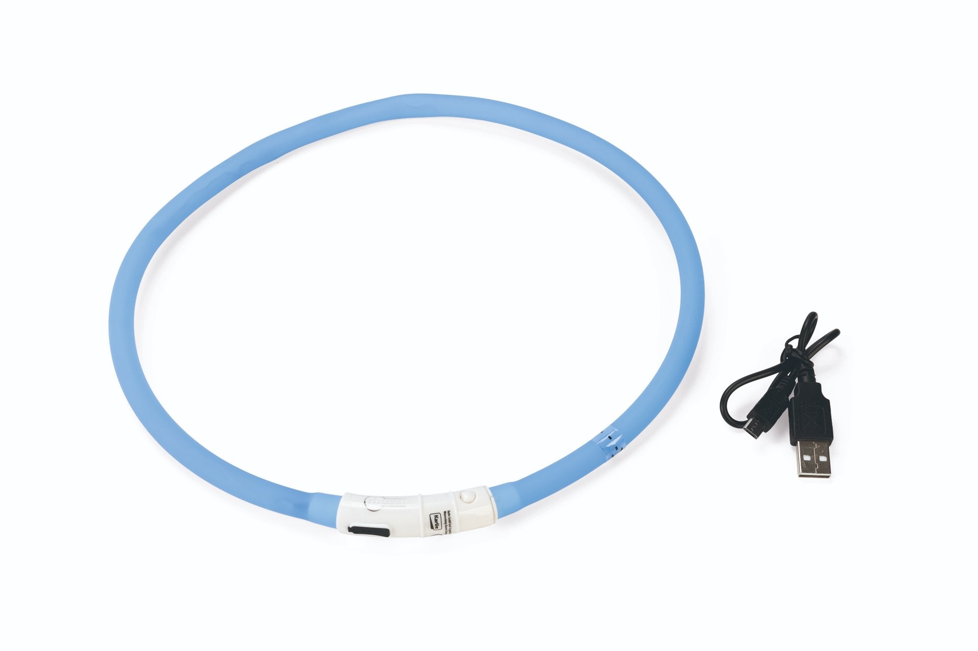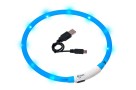LED svetelný obojok modrý viditeľný až cca 500 m. Nabíjacie batérie pomocou USB kábla - žiadne iné batérie nie sú potrebné - vodeodolný - blikajúce svetlo alebo kontinuálne svetlo. Veľkosť 20-70 cm.