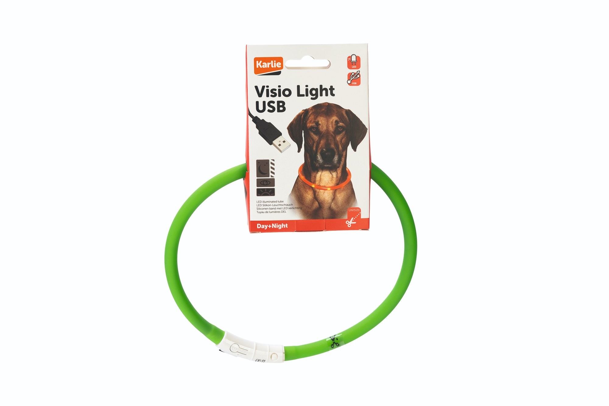LED svetelný obojok zelený viditeľný až cca 500 m. Nabíjacie batérie pomocou USB kábla - žiadne iné batérie nie sú potrebné - vodeodolný - blikajúce svetlo alebo kontinuálne svetlo. Veľkosť 20-70 cm. Celý popis