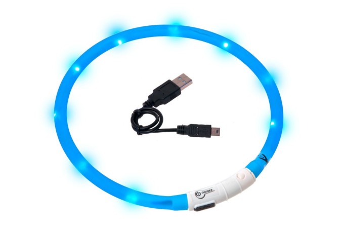 LED svetelný obojok modrý viditeľný až cca 500 m. Nabíjacie batérie pomocou USB kábla - žiadne iné batérie nie sú potrebné - vodeodolný - blikajúce svetlo alebo kontinuálne svetlo. Veľkosť 20-70 cm.