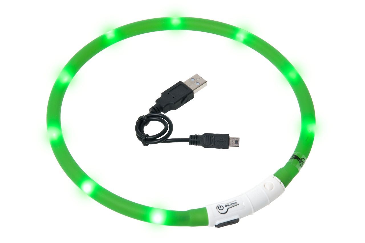 LED svetelný obojok zelený viditeľný až cca 500 m. Nabíjacie batérie pomocou USB kábla - žiadne iné batérie nie sú potrebné - vodeodolný - blikajúce svetlo alebo kontinuálne svetlo. Veľkosť 20-70 cm.