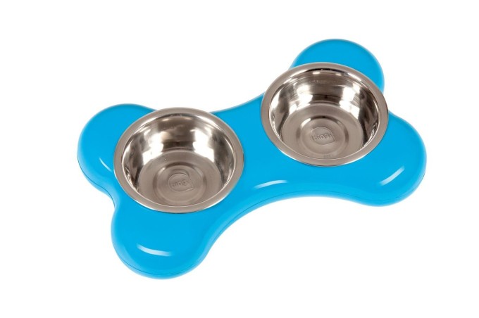 Dve praktické nerezové misky v modrom plastovom stojane pre väčšiu stabilitu misiek. Misky sa ľahko vyberajú. Veľkosť misky 2x400ml/36x22x8cm/