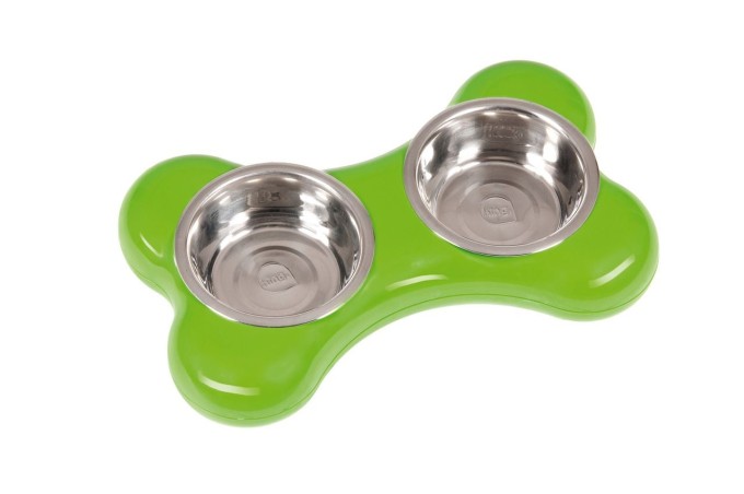 Dve praktické nerezové misky v zelenom plastovom stojane pre väčšiu stabilitu misiek. Misky sa ľahko vyberajú. Veľkosť misky 2x400ml/36x22x8cm/