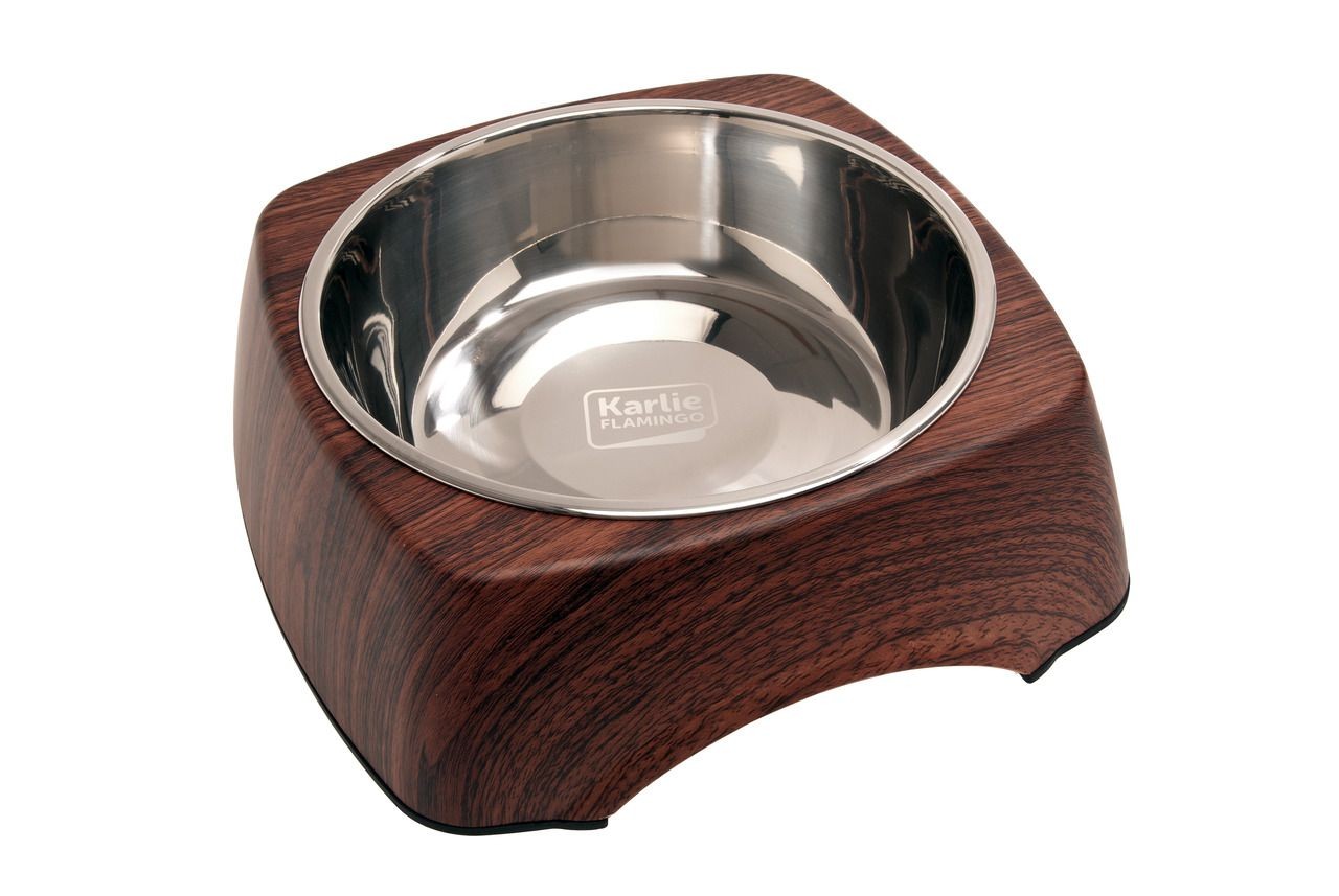 Krásny dizajnový doplnok interiéru v podobe plastového stojanu s nerezovou miskou, v imitácii prírodného dreva - palisander, veľkosť 1400 ml.
