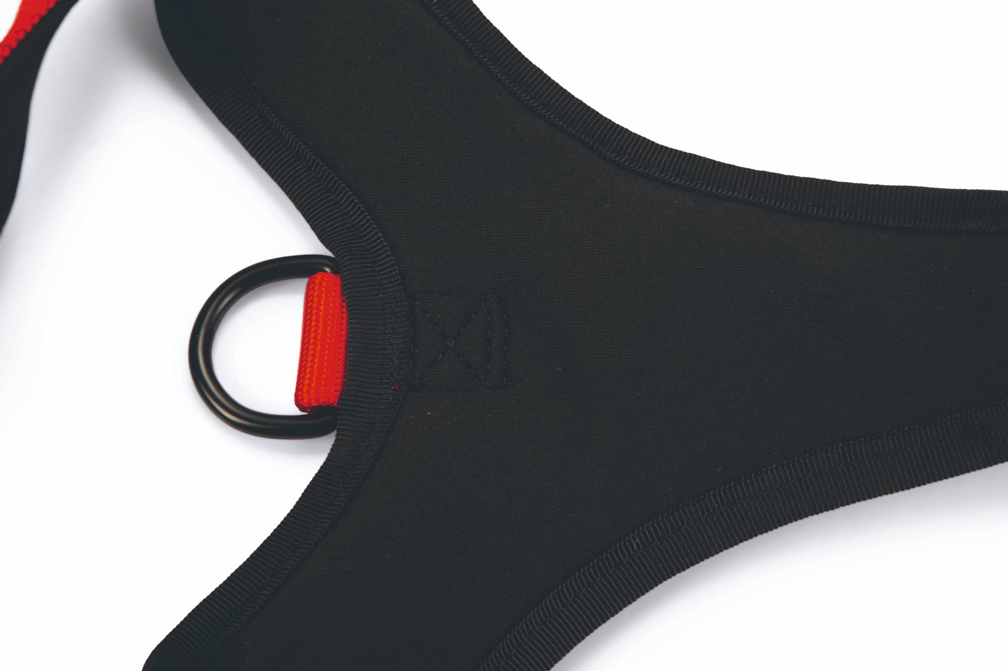 Nastaviteľný postroj s hrudným panelom v tvare "Y" pre optimálne rozloženie tlaku. Je podšitý rýchloschnúcim neoprénom odolným voči nečistotám. Dve možnosti pripevnenia vodítka - na chrbte a v oblasti hrudníka.
