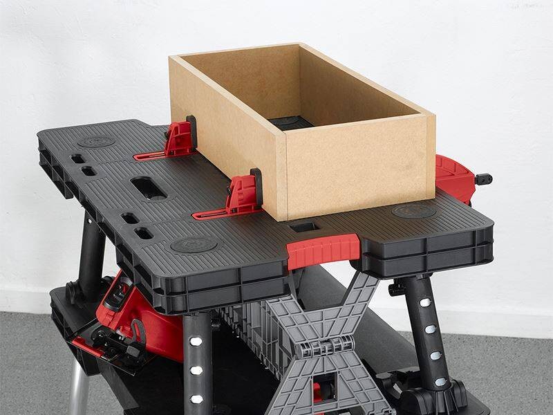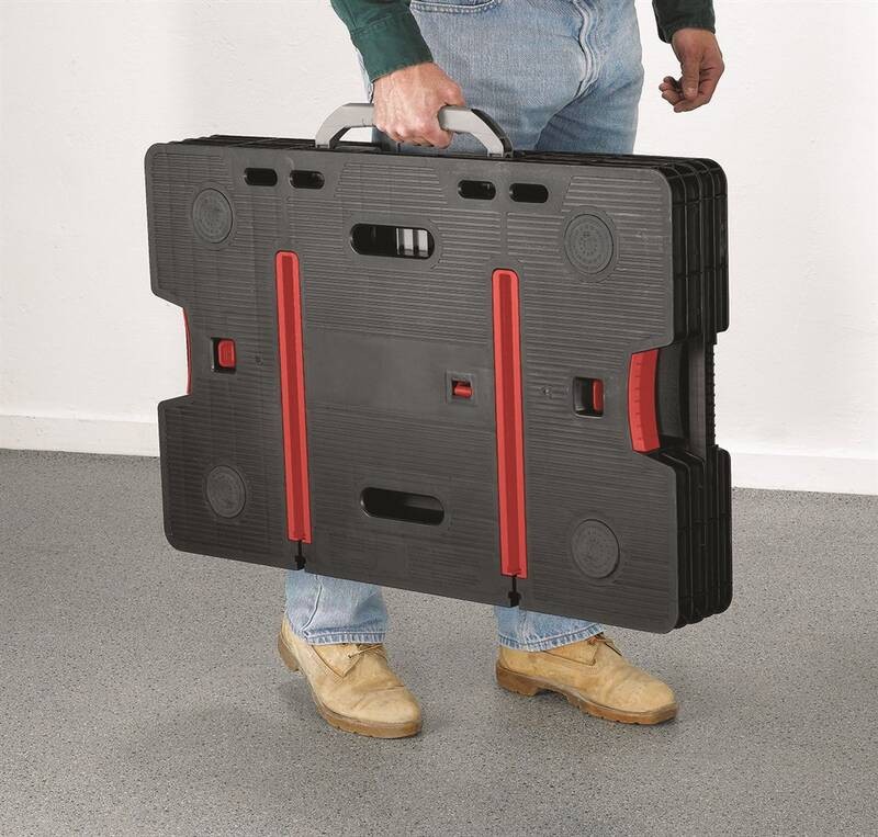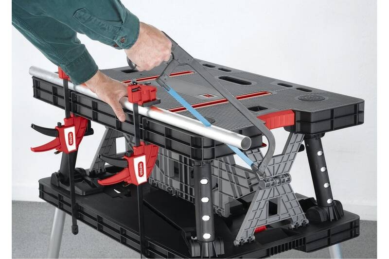 Tento přenosný stůl se zabudovanou rukojetí velmi snadno sestavíte (nezabere to více než půl minuty). Přitom nosnost činí 453 kilogramů. Součástí jsou dvě 30cm svorky, které lze nainstalovat horizontálně i vertikálně, nebo jednoduše odejmout.